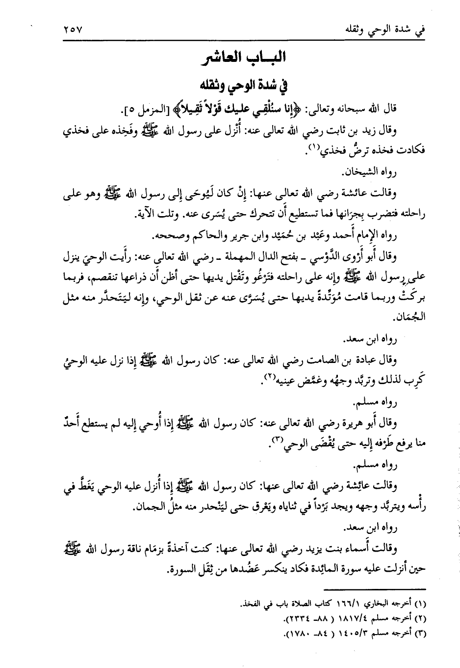 وقال أبو أروى الدوسى- بفتح الدال المهملة- رضي اللَّه تعالى عنه: رأيت الوحي ينزل على رسول اللَّه صلى الله عليه وسلم وإنه على راحلته فترغو وتفتل يديها حتى أظن أن ذراعها تنقصم، فربما بركت وربما قامت موتدة يديها حتى يسرى عنه عن ثقل الوحي، وإنه ليتحدر منه مثل الجمان.
