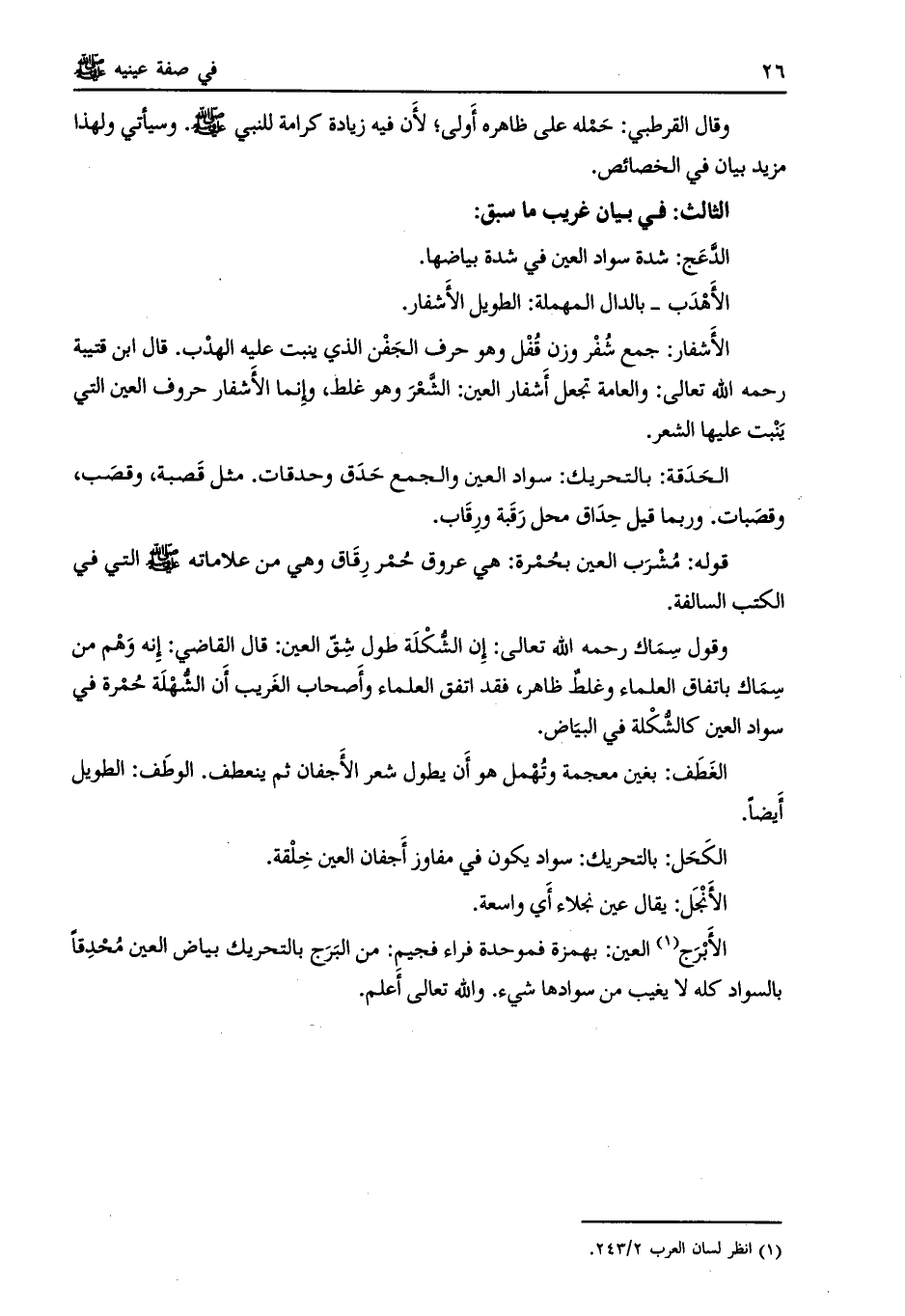 قوله: مشرب العين بحمرة: هي عروق حمر رقاق وهي من علاماته صلى الله عليه وسلم التي في الكتب السالفة.