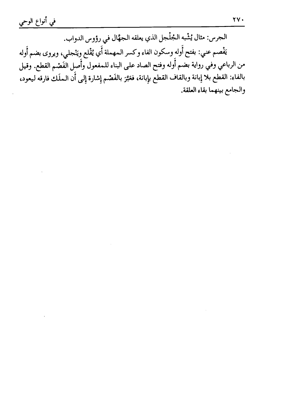 يفصم عني: بفتح أوله وسكون الفاء وكسر المهملة أي يقلع وينجلي، ويروى بضم أوله من الرباعي وفي رواية بضم أوله وفتح الصاد على البناء للمفعول وأصل الفصم القطع. وقيل بالفاء: القطع بلا إبانة وبالقاف القطع بإبانة، فعبّر بالفصم إشارة إلى أن الملك فارقه ليعود، والجامع بينهما بقاء العلقة.