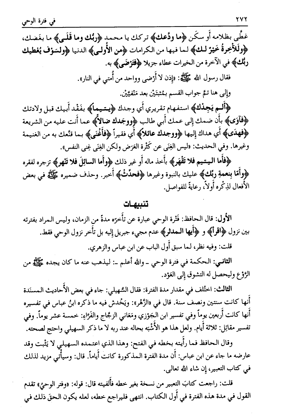 الأول: قال الحافظ: فترة الوحي عبارة عن تأخرّه مدة من الزمان، وليس المراد بفترته بين نزول اقْرَأْ وأَيُّهَا الْمُدَّثِّرُ عدم مجيء جبريل إليه بل تأخر نزول الوحي فقط.