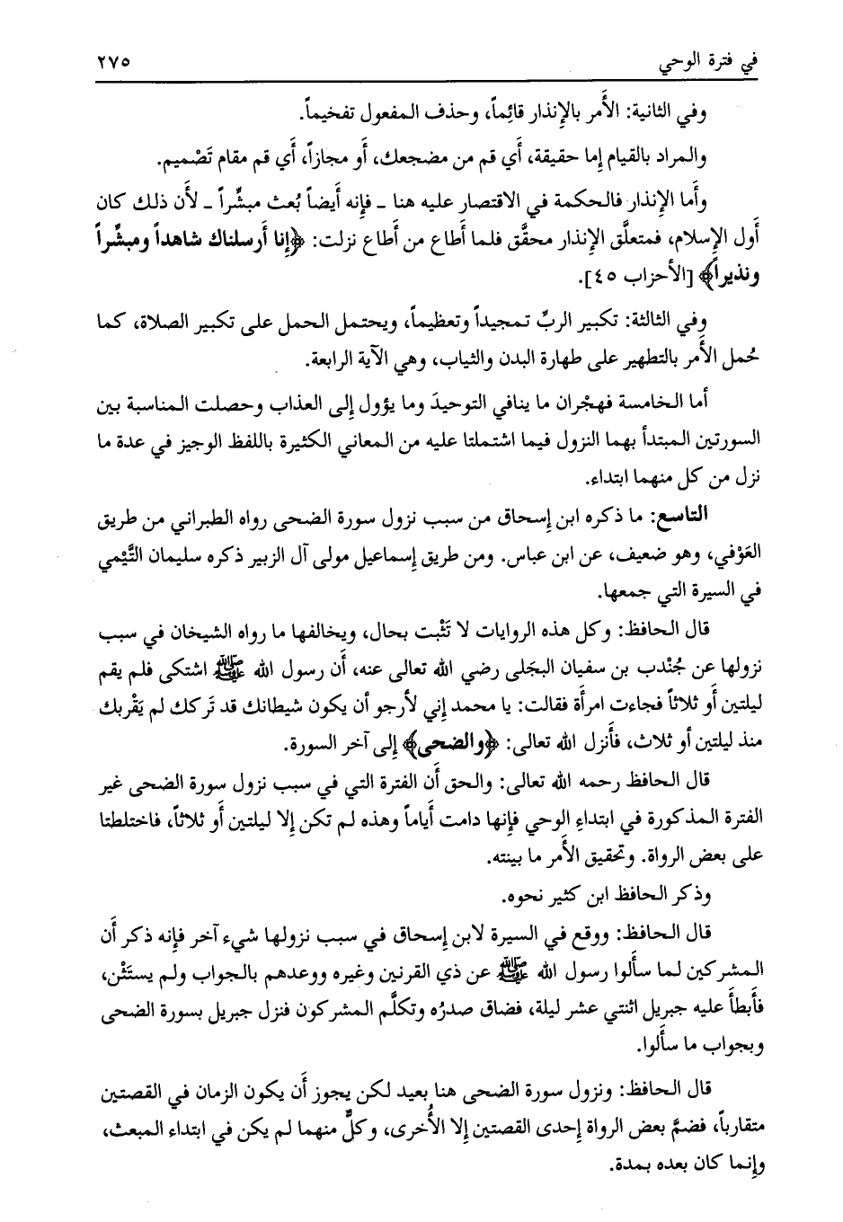 التاسع: ما ذكره ابن إسحاق من سبب نزول سورة الضحى رواه الطبراني من طريق العوفي، وهو ضعيف، عن ابن عباس. ومن طريق إسماعيل مولى آل الزبير ذكره سليمان التّيمي في السيرة التي جمعها.