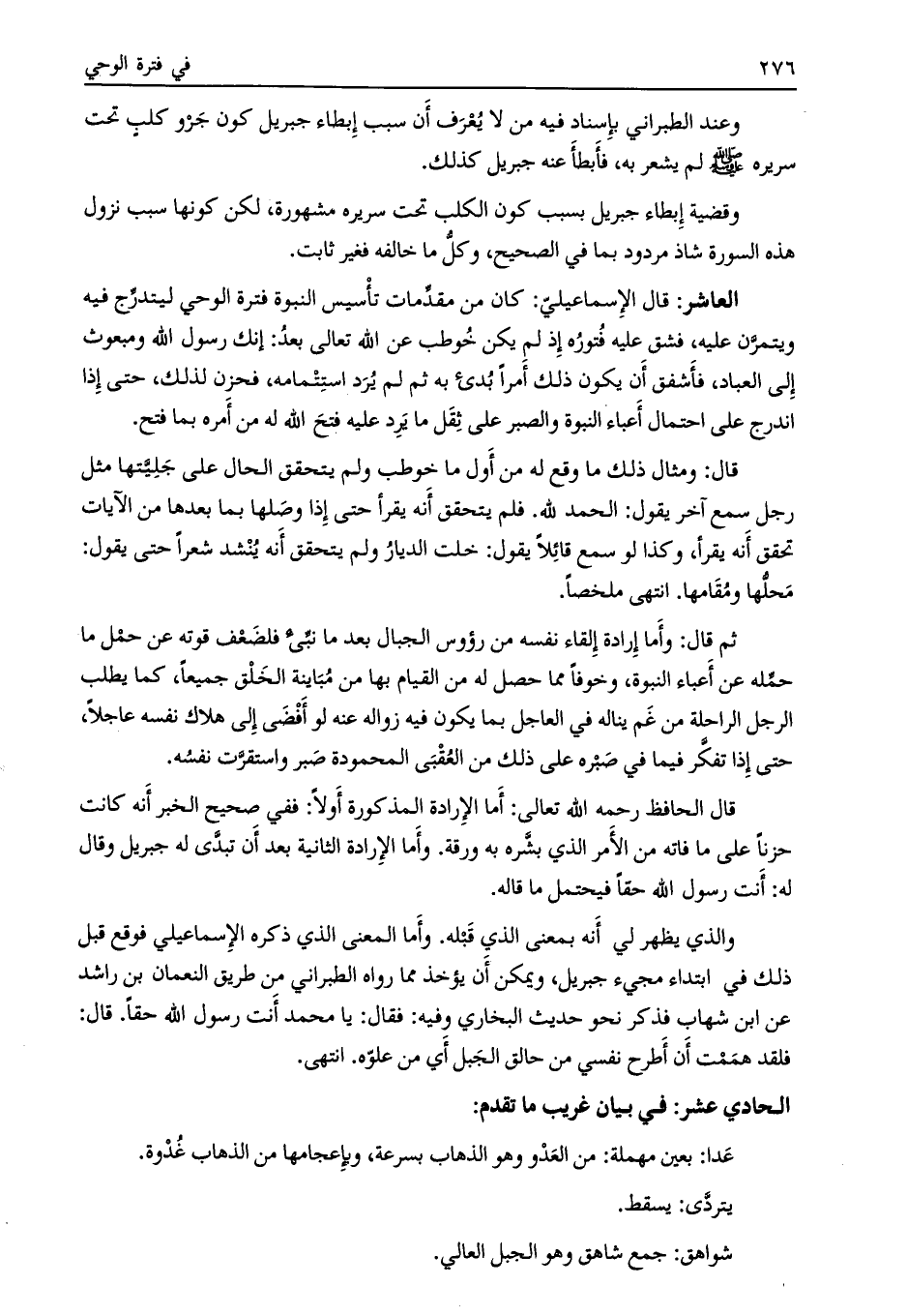 العاشر: قال الإسماعيليّ: كان من مقدّمات تأسيس النبوة فترة الوحي ليتدرّج فيه ويتمرّن عليه، فشق عليه فتوره إذا لم يكن خوطب عن اللَّه تعالى بعد: أنك رسول اللَّه ومبعوث إلى العباد، فأشفق أن يكون ذلك أمرا بدئ به ثم لم يرد استتمامه، فحزن لذلك، حتى إذا اندرج على احتمال أعباء النبوة والصبر على ثقل ما يرد عليه فتح اللَّه له من أمره بما فتح.
