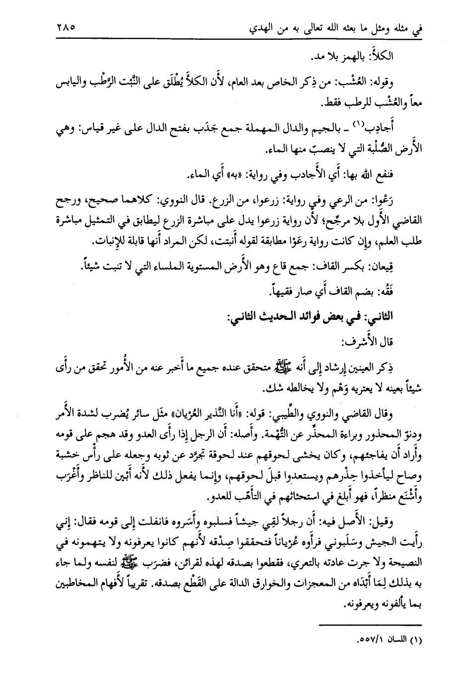 وقيل: الأصل فيه: أن رجلاً لقى جيشا فسلبوه وأسروه فانفلت إلى قومه فقال: إني رأيت الجيش وسلبوني فرأوه عريانا فتحققوا صدقه لأنهم كانوا يعرفونه ولا يتهمونه في النصيحة ولا جرت عادته بالتعري، فقطعوا بصدقه لهذه لقرائن، فضرب صلى الله عليه وسلّم لنفسه ولما جاء به بذلك لما أبداه من المعجزات والخوارق الدالة على القطع بصدقه. تقريبا لأفهام المخاطبين بما يألفونه ويعرفونه.