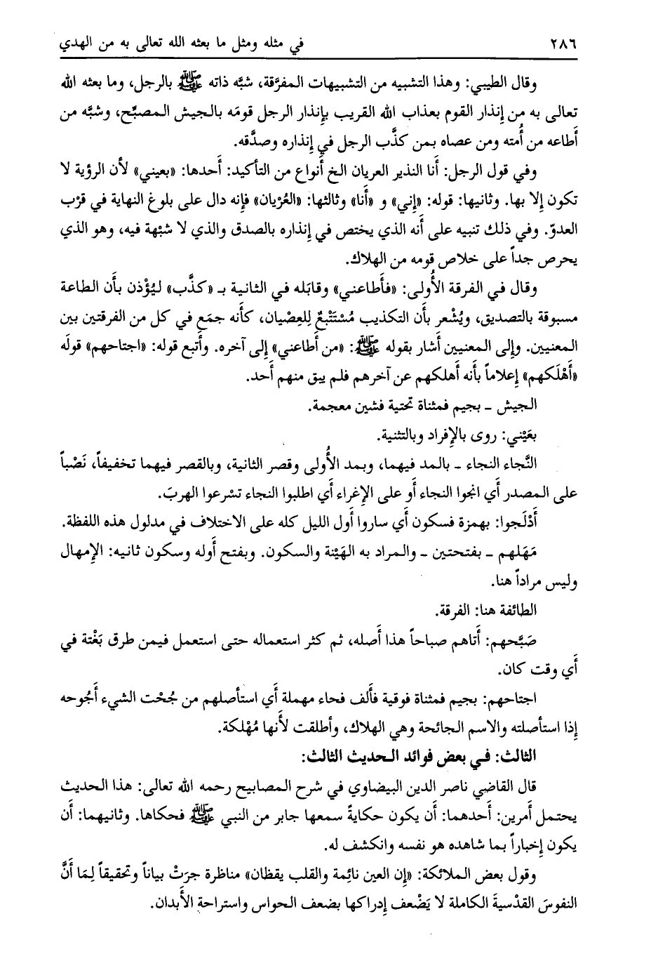 وقال الطيبي: وهذا التشبيه من التشبيهات المفرّقة، شبّه ذاته صلى الله عليه وسلّم بالرجل، وما بعثه اللَّه تعالى به من إنذار القوم بعذاب اللَّه القريب بإنذار الرجل قومه بالجيش المصبّح، وشبّه من أطاعه من أمته ومن عصاه بمن كذّب الرجل في إنذاره وصدّقه.