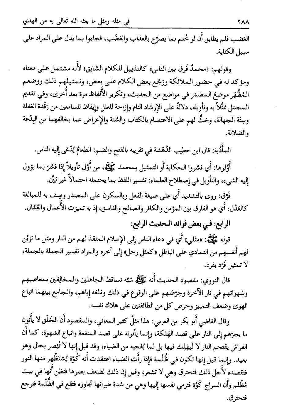 وقولهم: «محمّد فرق بين الناس» كالتذييل للكلام السّابق، لأنه مشتمل على معناه ومؤكد له في حضور الملائكة ورجع بعض الكلام على بعض، وتمثيلهم ذلك ووضعهم المظهر موضع المضمر في مواضع من الحديث، وتكرير الألفاظ مرة بعد أخرى، وفي تقديم المجمل ممثّلا به وتأويله، دلالة على الإرشاد التام وإزاحة للعلل وإيقاظ للسامعين من رقدة الغفلة وسنة الجهالة، وحثّ لهم على الاعتصام بالكتاب والسّنة والإعراض عما يخالفهما من البدعة والضلالة.