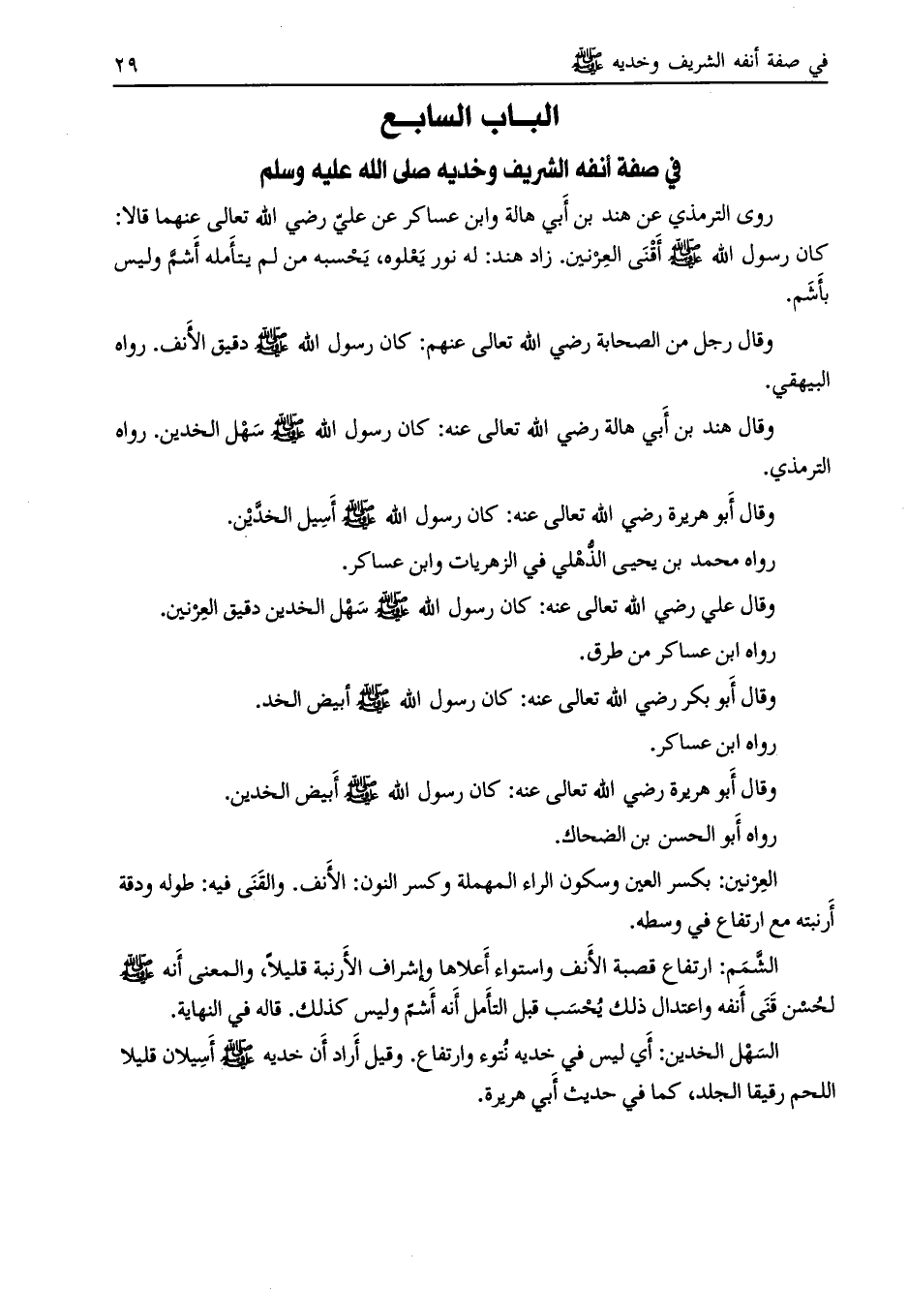 الباب السابع في صفة انفه الشريف وخديه صلى اللَّه عليه وسلم