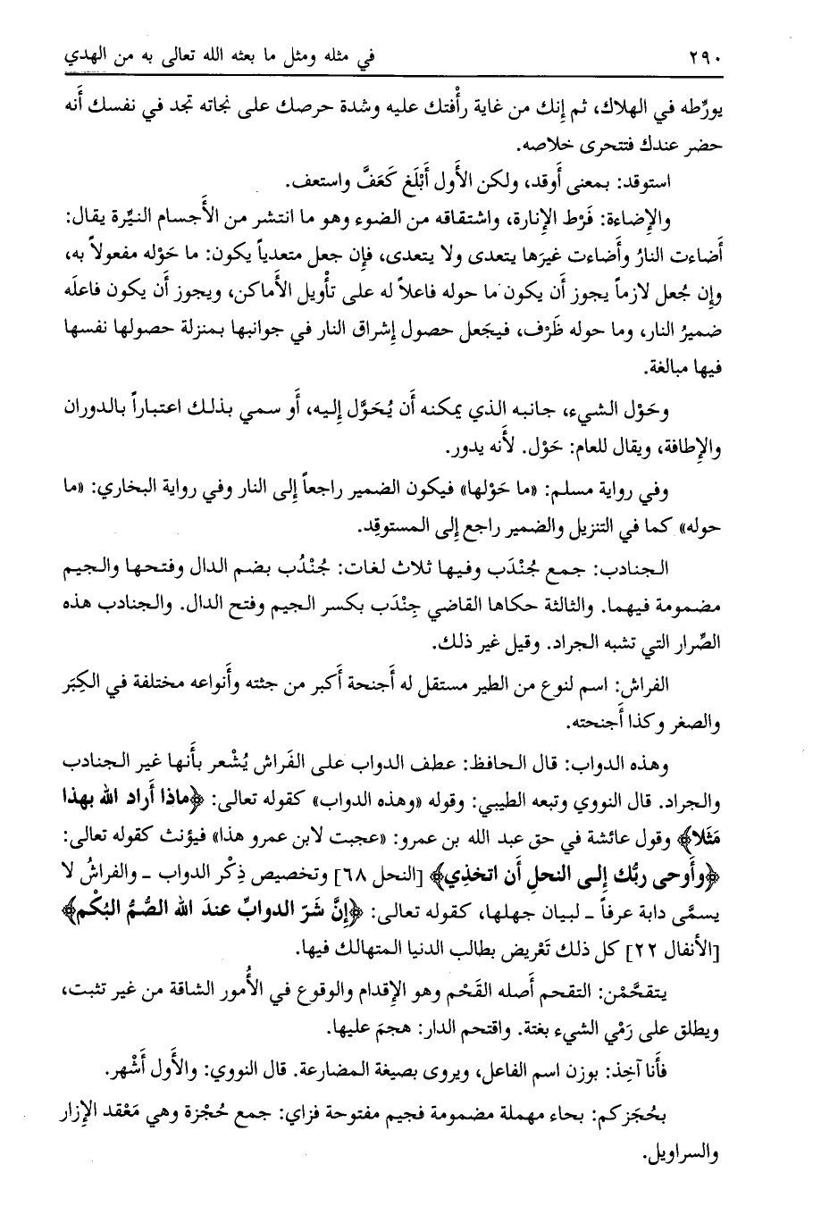 وهذه الدواب: قال الحافظ: عطف الدواب على الفراش يشعر بأنها غير الجنادب والجراد. قال النووي وتبعه الطيبي: وقوله «وهذه الدواب» كقوله تعالى: ماذا أَرادَ اللَّهُ بِهذا مَثَلًا وقول عائشة في حق عبد الله بن عمرو: «عجبت لابن عمرو هذا» فيؤنث كقوله تعالى: