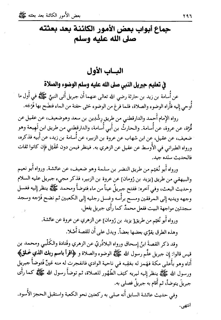 ورواه أبو نعيم من طريق النضر بن سلمة وهو ضعيف، عن عائشة. ورواه أبو نعيم والبيهقي من طريق [يزيد بن رومان] عن عروة بن الزبير، فذكر مجيء جبريل عليه السلام وحديث البعث، وفي آخره: ففتح جبريل عينا من ماء فتوضأ ومحمد صلى الله عليه وسلم ينظر إليه فغسل وجهه ويديه إلى المرفقين ومسح برأسه وغسل رجليه إلى الكعبين ثم نضح فرجه وسجد سجدتين مواجهة البيت ففعل محمد كما رأى جبريل يفعل.