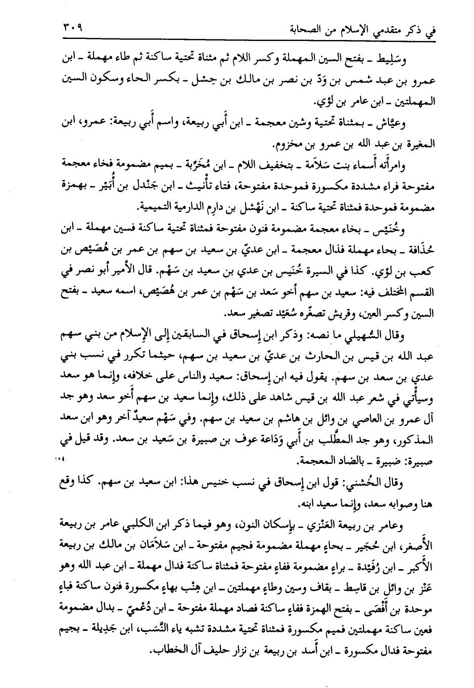 وقال الخشني: قول ابن إسحاق في نسب خنيس هذا: ابن سعيد بن سهم. كذا وقع هنا وصوابه سعد، وإنما سعيد ابنه.