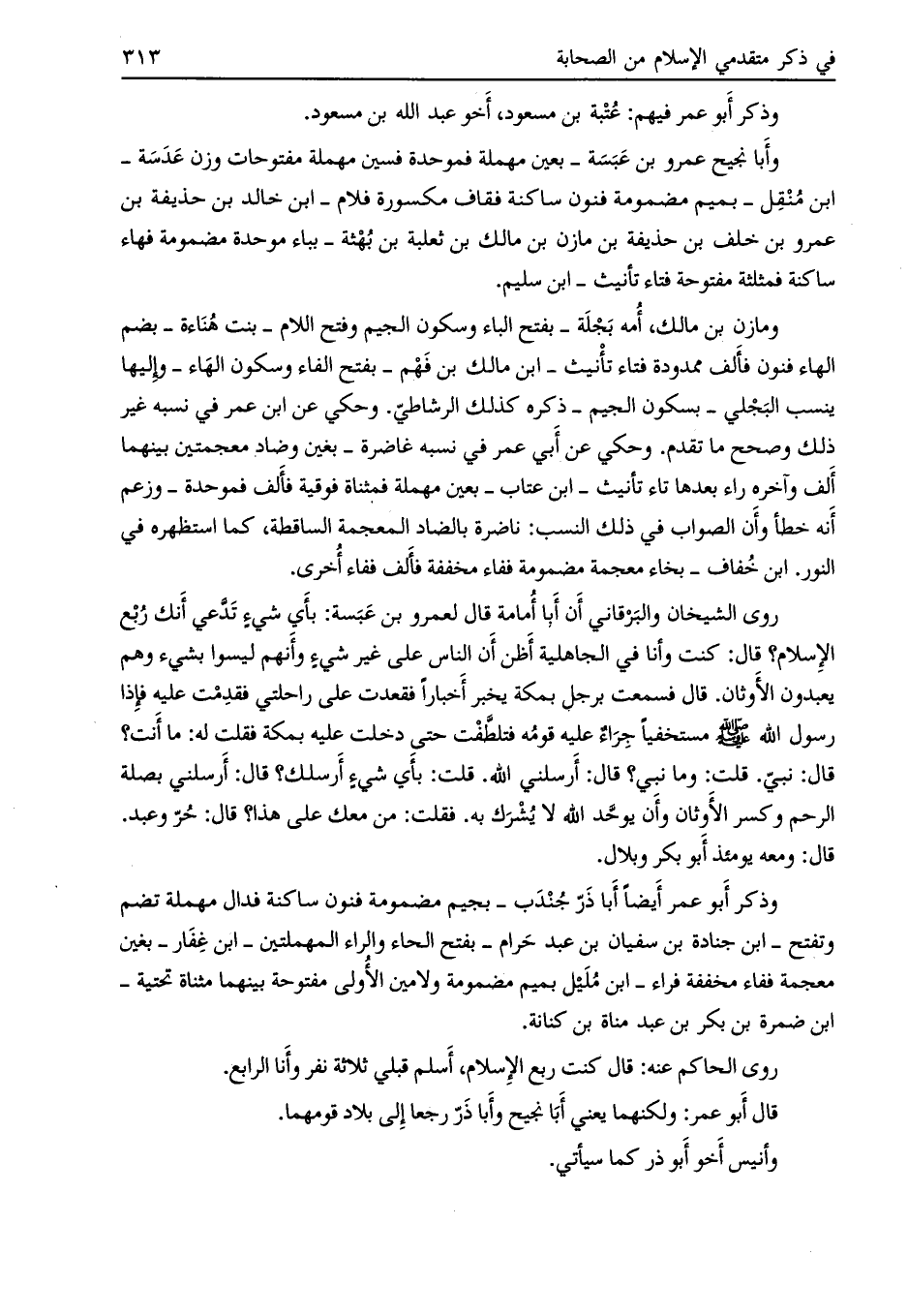وأبا نجيح عمرو بن عبسة- بعين مهملة فموحدة فسين مهملة مفتوحات وزن عدسة- ابن منقل- بميم مضمومة فنون ساكنة فقاف مكسورة فلام- ابن خالد بن حذيفة بن عمرو بن خلف بن حذيفة بن مازن بن مالك بن ثعلبة بن بهثة- بباء موحدة مضمومة فهاء ساكنة فمثلثة مفتوحة فتاء تأنيث- ابن سليم.
