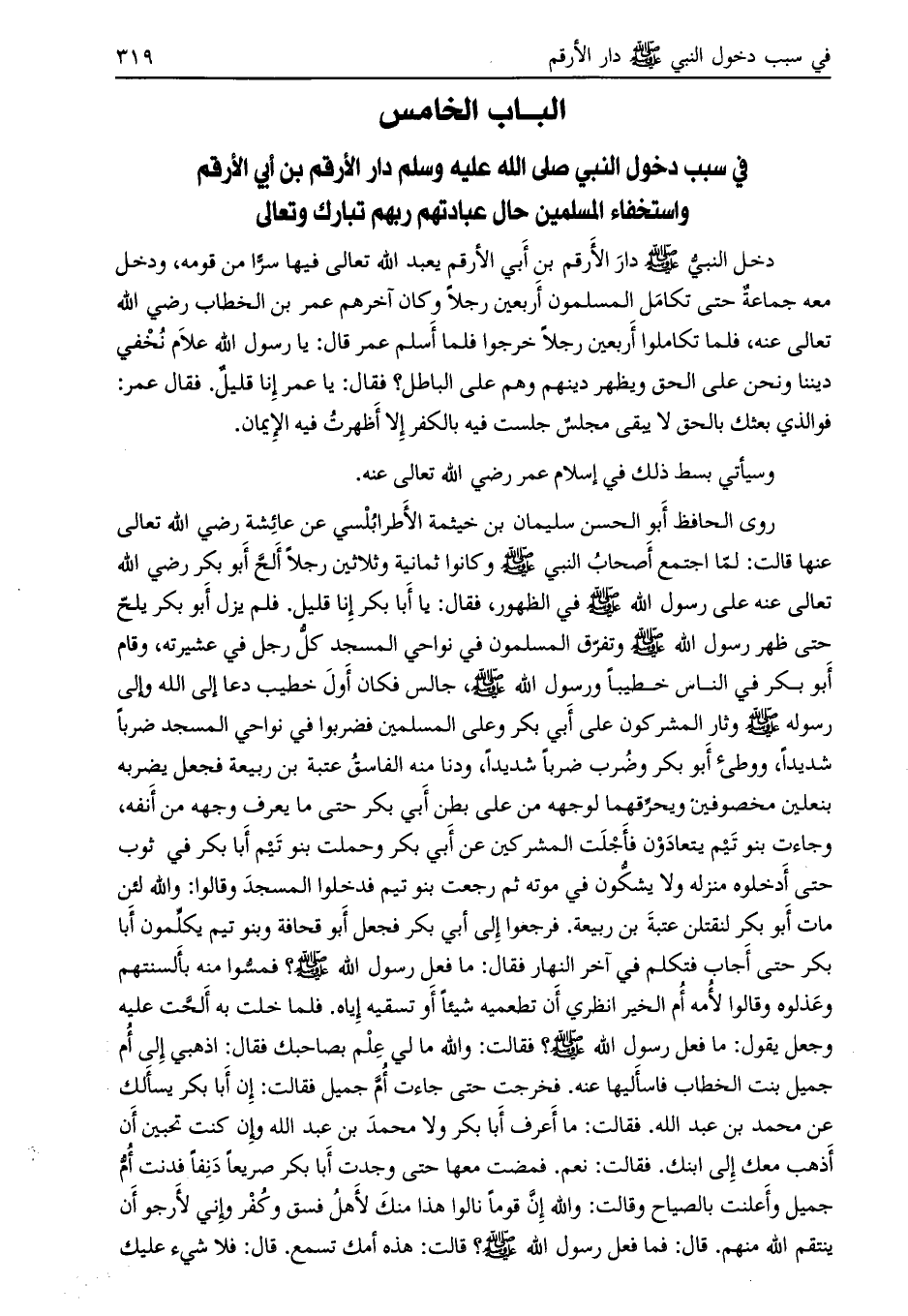 الباب الخامس في سبب دخول النبي صلى الله عليه وسلم دار الأرقم بن أبي الأرقم واستخفاء المسلمين حال عبادتهم ربّهم تبارك وتعالى