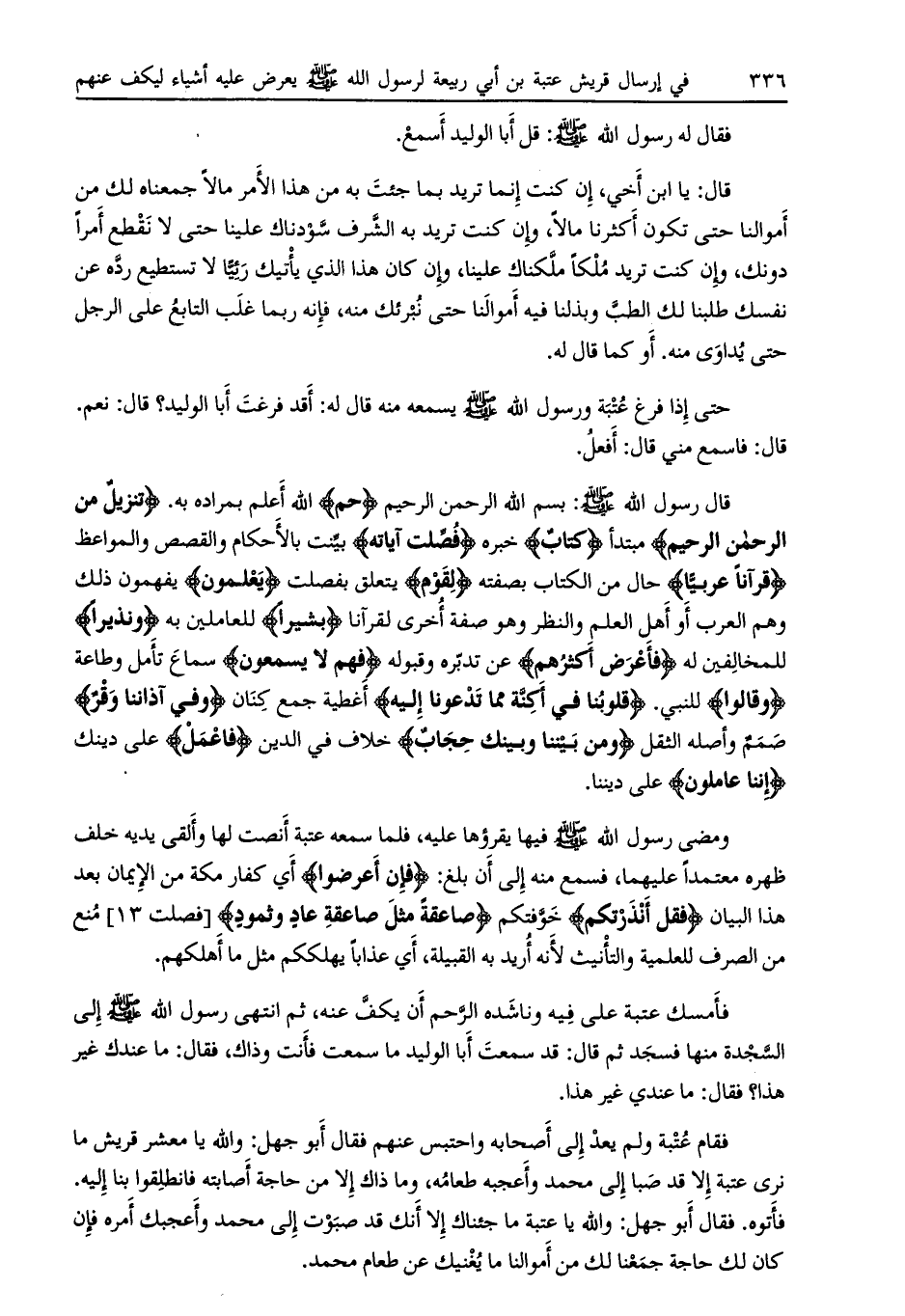 حتى إذا فرغ عتبة ورسول اللَّه صلى الله عليه وسلم يسمعه منه قال له: أقد فرغت أبا الوليد؟ قال: نعم.