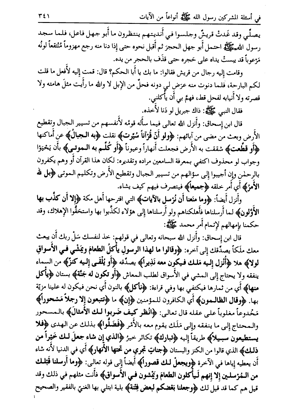 قال ابن إسحاق: وأنزل اللَّه سبحانه وتعالى في قولهم: خذ لنفسك سل ربك أن يبعث معك ملكا يصدّقك إلى آخره: وَقالُوا مالِ هذَا الرَّسُولِ يَأْكُلُ الطَّعامَ وَيَمْشِي فِي الْأَسْواقِ لَوْلا هلا أُنْزِلَ إِلَيْهِ مَلَكٌ فَيَكُونَ مَعَهُ نَذِيراً يصدّقه أَوْ يُلْقى إِلَيْهِ كَنْزٌ من السماء ينفقه ولا يحتاج إلى المشي في الأسواق لطلب المعاش أَوْ تَكُونُ لَهُ جَنَّةٌ بستان يَأْكُلُ مِنْها أي من ثمارها فيكتفي بها وفي قراءة: نأكل بالنون أي نحن فيكون له علينا مزيّة بها. وَقالَ الظَّالِمُونَ أي الكافرون للمؤمنين إِنْ ما تَتَّبِعُونَ إِلَّا رَجُلًا مَسْحُوراً مخدوعا مغلوبا على عقله قال تعالى: انْظُرْ كَيْفَ ضَرَبُوا لَكَ الْأَمْثالَ بالمسحور والمحتاج إلى ما ينفقه وإلى ملك يقوم معه بالأمر فَضَلُّوا بذلك عن الهدى فَلا يَسْتَطِيعُونَ سَبِيلًا طريقا إليه تَبارَكَ تكاثر خير الَّذِي إِنْ شاءَ جَعَلَ لَكَ خَيْراً مِنْ ذلِكَ الذي قالوا من الكنز والبستان جَنَّاتٍ تَجْرِي مِنْ تَحْتِهَا الْأَنْهارُ أي في الدنيا لأنه شاء أن يعطيه إياها في الآخرة وَيَجْعَلْ لَكَ قُصُوراً أيضا إلى قوله تعالى: وَما أَرْسَلْنا قَبْلَكَ مِنَ الْمُرْسَلِينَ إِلَّا إِنَّهُمْ لَيَأْكُلُونَ الطَّعامَ وَيَمْشُونَ فِي الْأَسْواقِ فأنت مثلهم في ذلك وقد قيل هم كما قد قيل لك وَجَعَلْنا بَعْضَكُمْ لِبَعْضٍ فِتْنَةً بلية ابتلي بها الغنيّ بالفقير والصحيح