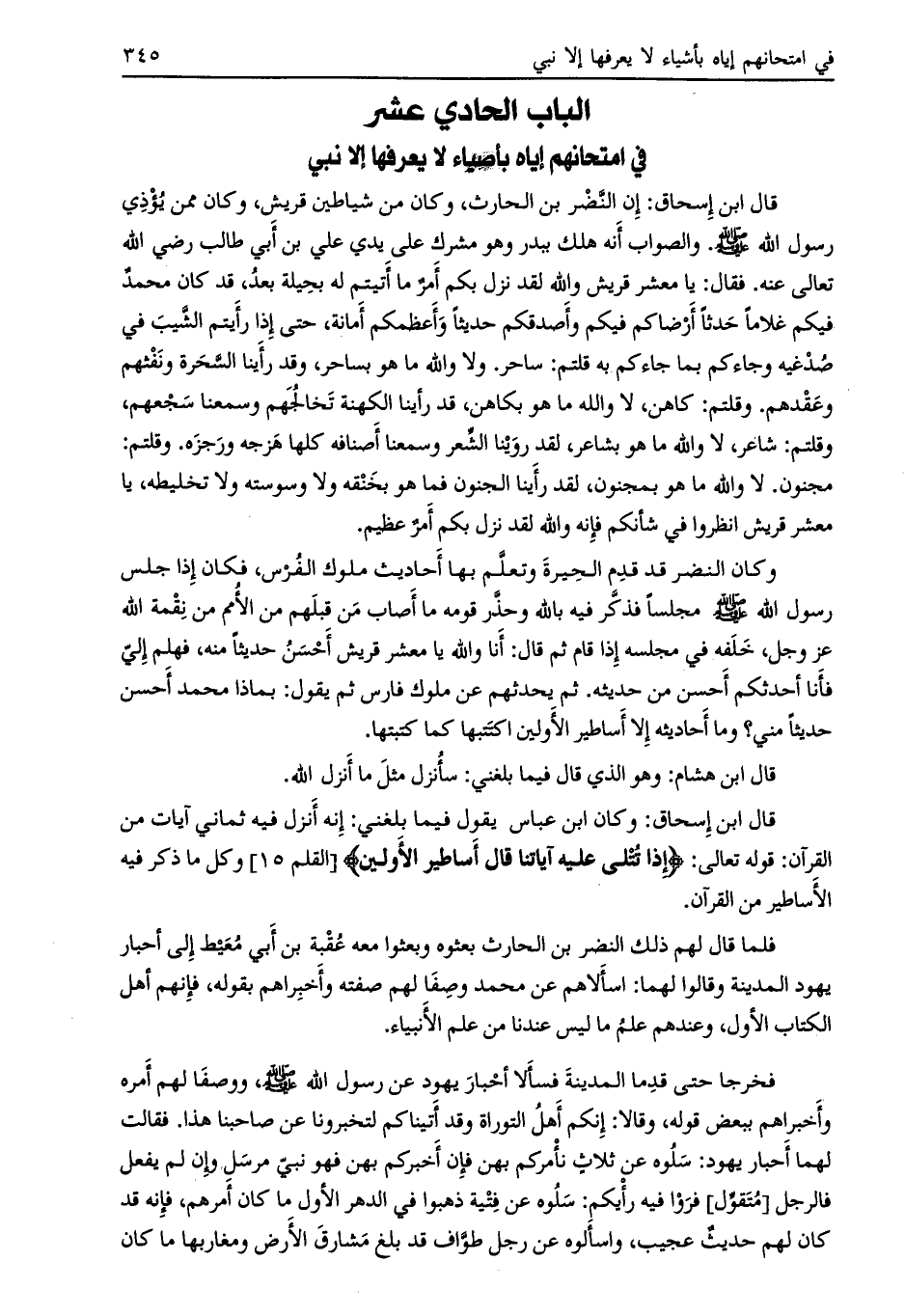 قال ابن إسحاق: وكان ابن عباس يقول فيما بلغني: إنه أنزل فيه ثماني آيات من القرآن: قوله تعالى: إِذا تُتْلى عَلَيْهِ آياتُنا قالَ أَساطِيرُ الْأَوَّلِينَ [القلم 15] وكل ما ذكر فيه الأساطير من القرآن.