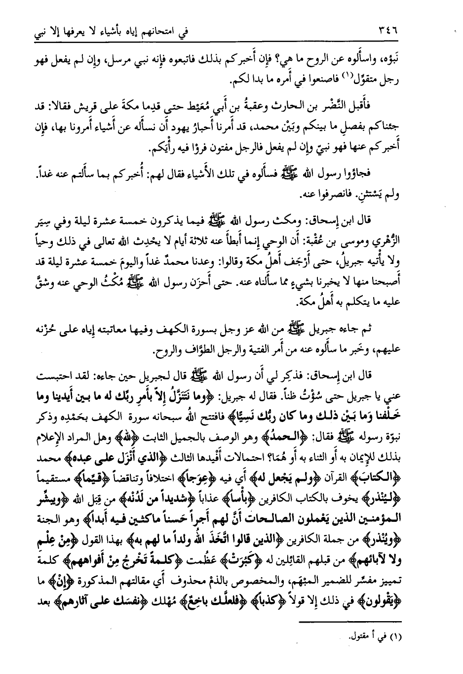 قال ابن إسحاق: فذكر لي إن رسول اللَّه صلى الله عليه وسلم قال لجبريل حين جاءه: لقد احتبست عني يا جبريل حتى سؤت ظنا. فقال له جبريل: وَما نَتَنَزَّلُ إِلَّا بِأَمْرِ رَبِّكَ لَهُ ما بَيْنَ أَيْدِينا وَما خَلْفَنا وَما بَيْنَ ذلِكَ وَما كانَ رَبُّكَ نَسِيًّا فافتتح اللَّه سبحانه سورة الكهف بحمده وذكر نبوّة رسوله صلى الله عليه وسلم