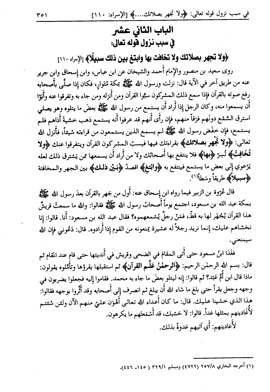 الباب الثاني عشر في سبب نزول قوله تعالى: وَلا تَجْهَرْ بِصَلاتِكَ وَلا تُخافِتْ بِها وَابْتَغِ بَيْنَ ذلِكَ سَبِيلًا