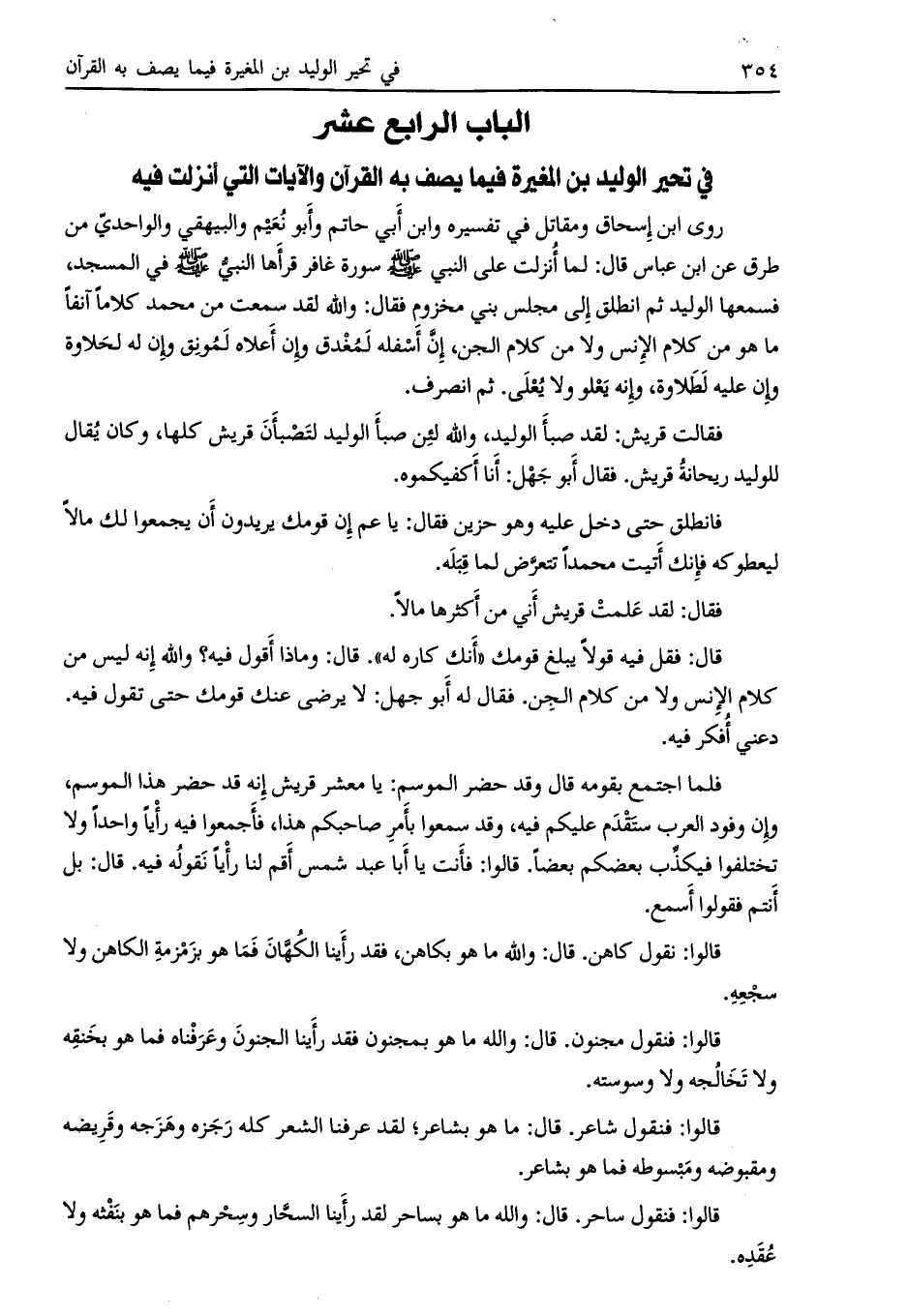 الباب الرابع عشر في تحيّر الوليد بن المغيرة فيما يصف به القرآن والآيات التي أنزلت فيه