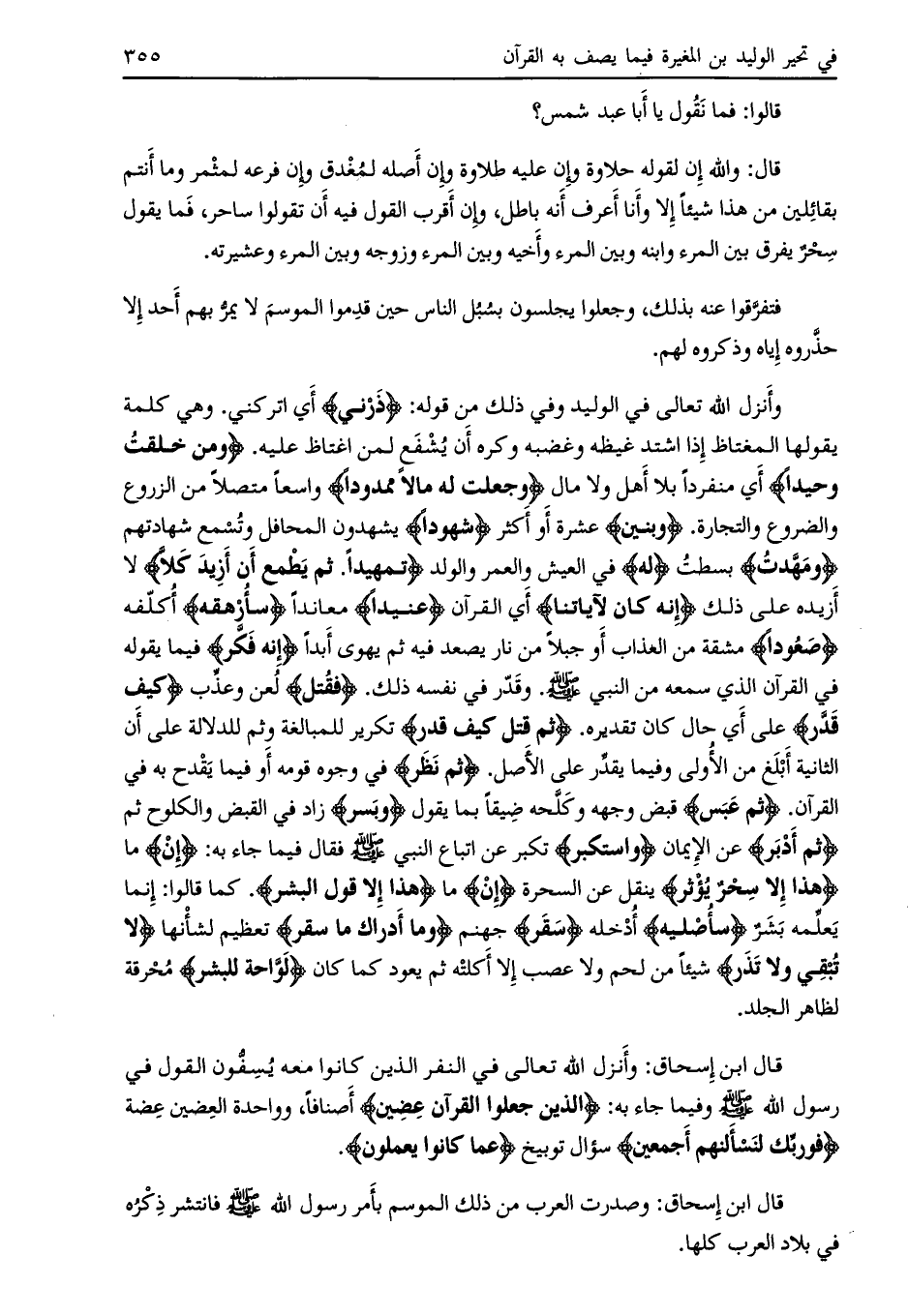 وأنزل اللَّه تعالى في الوليد وفي ذلك من قوله: ذَرْنِي أي اتركني. وهي كلمة يقولها المغتاظ إذا اشتد غيظه وغضبه وكره أن يشفع لمن اغتاظ عليه. وَمَنْ خَلَقْتُ وَحِيداً أي منفردا بلا أهل ولا مال وَجَعَلْتُ لَهُ مالًا مَمْدُوداً واسعا متصلا من الزروع والضروع والتجارة. وَبَنِينَ عشرة أو أكثر شُهُوداً يشهدون المحافل وتسمع شهادتهم وَمَهَّدْتُ بسطت لَهُ في العيش والعمر والولد تَمْهِيداً. ثُمَّ يَطْمَعُ أَنْ أَزِيدَ كَلَّا لا أزيده على ذلك إِنَّهُ كانَ لِآياتِنا أي القرآن عَنِيداً معاندا سَأُرْهِقُهُ أكلّفه صَعُوداً مشقة من العذاب أو جبلا من نار يصعد فيه ثم يهوى أبدا إِنَّهُ فَكَّرَ فيما يقوله في القرآن الذي سمعه من النبي صلى الله عليه وسلم. وقدّر في نفسه ذلك. فَقُتِلَ لعن وعذّب كَيْفَ قَدَّرَ على أي حال كان تقديره. ثُمَّ قُتِلَ كَيْفَ قَدَّرَ تكرير للمبالغة وثم للدلالة على أن الثانية أبلغ من الأولى وفيما يقدّر على الأصل. ثُمَّ نَظَرَ في وجوه قومه أو فيما يقدح به في القرآن. ثُمَّ عَبَسَ قبض وجهه وكلّحه ضيقا بما يقول وَبَسَرَ زاد في القبض والكلوح ثم ثُمَّ أَدْبَرَ عن الإيمان وَاسْتَكْبَرَ تكبر عن اتباع النبي صلى الله عليه وسلم فقال فيما جاء به: إِنْ ما هذا إِلَّا سِحْرٌ يُؤْثَرُ ينقل عن السحرة إِنْ ما هذا إِلَّا قَوْلُ الْبَشَرِ. كما قالوا: إنما يعلمه بشر سَأُصْلِيهِ أدخله سَقَرَ جهنم وَما أَدْراكَ ما سَقَرُ تعظيم لشأنها لا تُبْقِي وَلا تَذَرُ شيئا من لحم ولا عصب إلا أكلته ثم يعود كما كان لَوَّاحَةٌ لِلْبَشَرِ محرقة لظاهر الجلد.