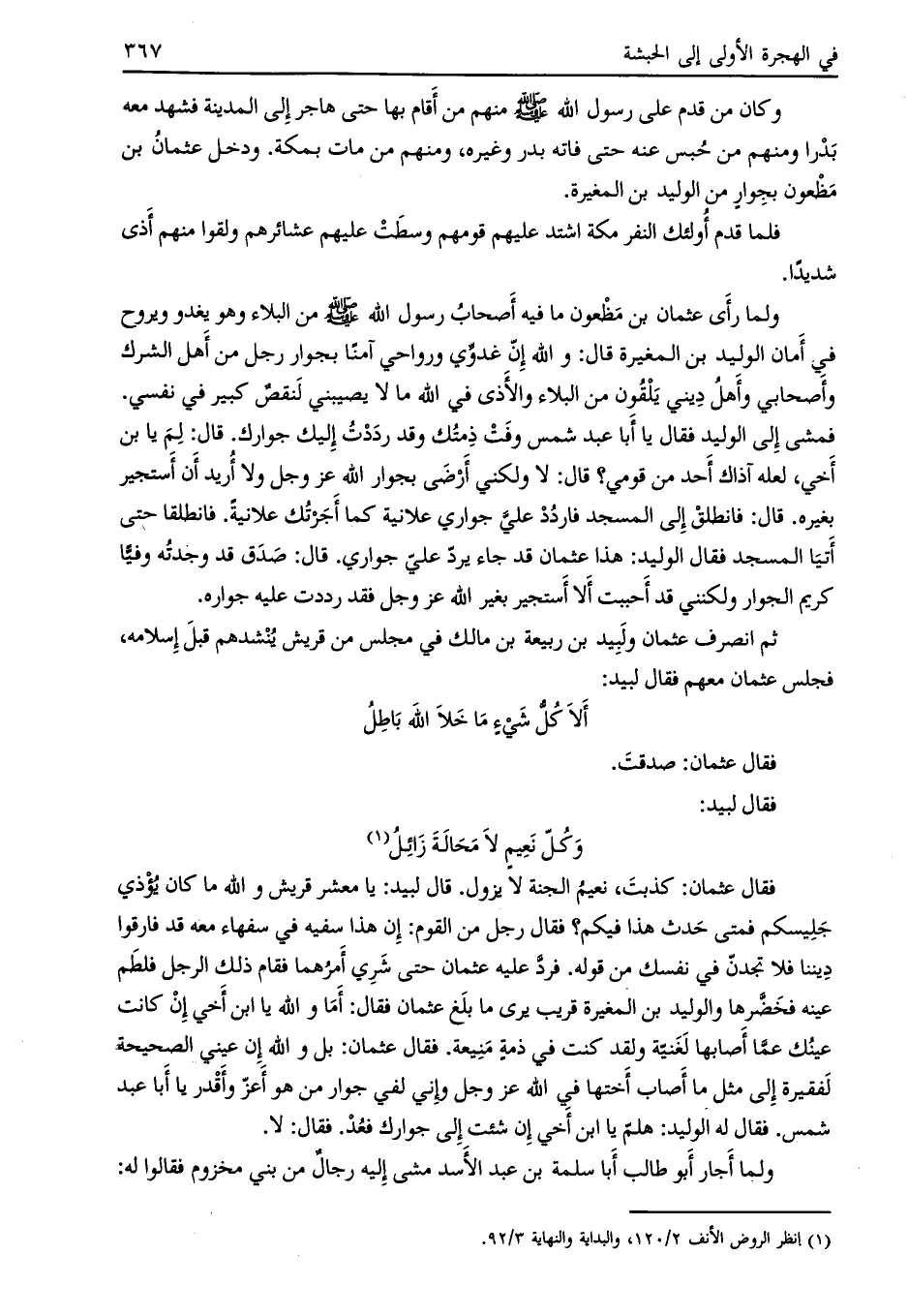 [ (1) ] فقال عثمان: كذبت، نعيم الجنة لا يزول. قال لبيد: يا معشر قريش واللَّه ما كان يؤذي جليسكم فمتى حدث هذا فيكم؟ فقال رجل من القوم: إن هذا سفيه في سفهاء معه قد فارقوا ديننا فلا تجدنّ في نفسك من قوله. فردّ عليه عثمان حتى شري أمرهما فقام ذلك الرجل فلطم عينه فخضّرها والوليد بن المغيرة قريب يرى ما بلغ عثمان فقال: أما واللَّه يا ابن أخي إن كانت عينك عمّا أصابها لغنيّة ولقد كنت في ذمة منيعة. فقال عثمان: بل واللَّه إن عيني الصحيحة لفقيرة إلى مثل ما أصاب أختها في اللَّه عز وجل وإني لفي جوار من هو أعزّ وأقدر يا أبا عبد شمس. فقال له الوليد: هلمّ يا ابن أخي إن شئت إلى جوارك فعد. فقال: لا.