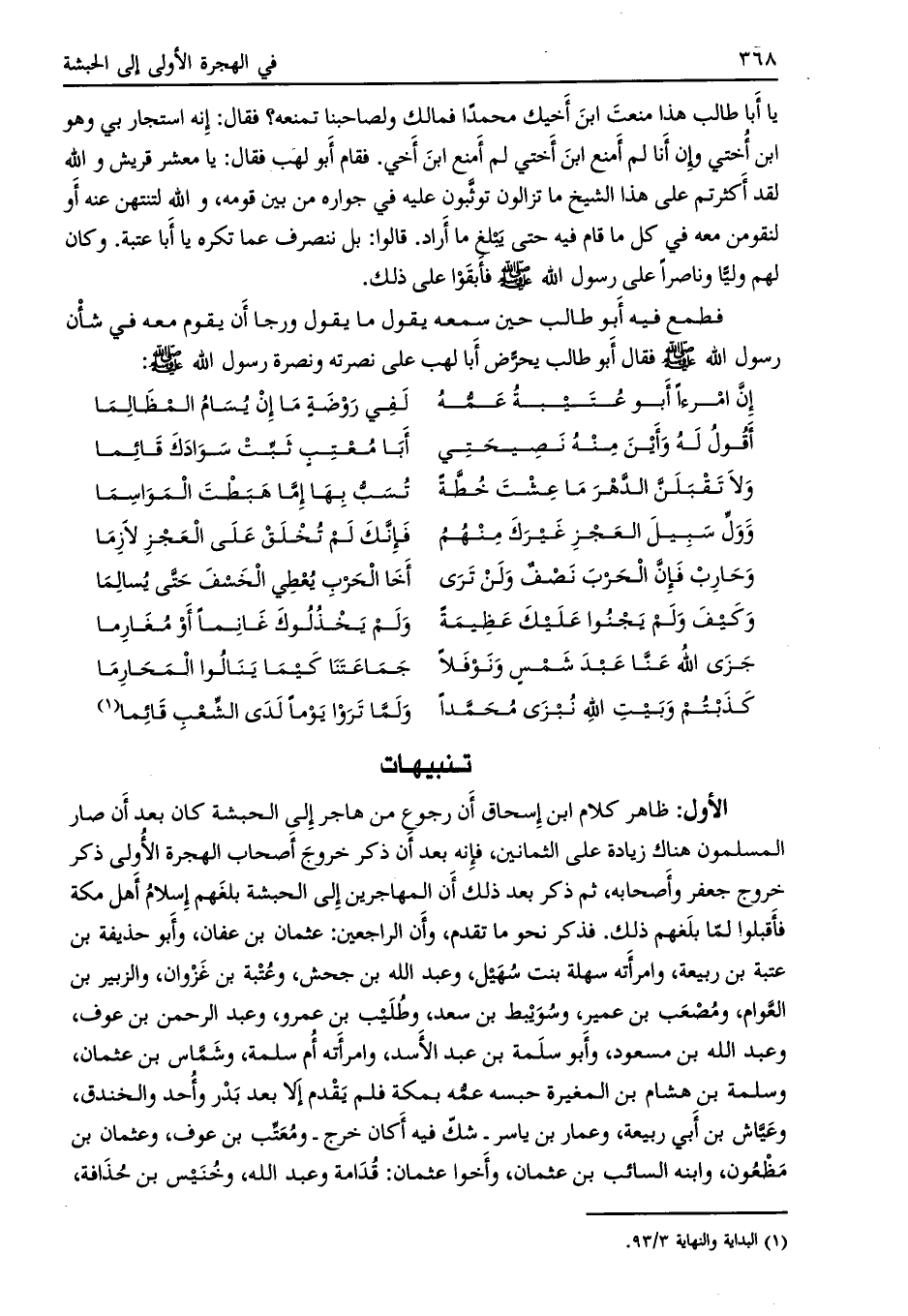 الأول: ظاهر كلام ابن إسحاق أن رجوع من هاجر إلى الحبشة كان بعد أن صار المسلمون هناك زيادة على الثمانين، فإنه بعد أن ذكر خروج أصحاب الهجرة الأولى ذكر خروج جعفر وأصحابه، ثم ذكر بعد ذلك أن المهاجرين إلى الحبشة بلغهم إسلام أهل مكة فأقبلوا لمّا بلغهم ذلك. فذكر نحو ما تقدم، وأن الراجعين: عثمان بن عفان، وأبو حذيفة بن عتبة بن ربيعة، وامرأته سهلة بنت سهيل، وعبد الله بن جحش، وعتبة بن غزوان، والزبير بن العوام، ومصعب بن عمير، وسويبط بن سعد، وطليب بن عمرو، وعبد الرحمن بن عوف، وعبد الله بن مسعود، وأبو سلمة بن عبد الأسد، وامرأته أم سلمة، وشمّاس بن عثمان، وسلمة بن هشام بن المغيرة حبسه عمّه بمكة فلم يقدم إلا بعد بدر وأحد والخندق، وعيّاش بن أبي ربيعة، وعمار بن ياسر- شكّ فيه أكان خرج- ومعتّب بن عوف، وعثمان بن مظعون، وابنه السائب بن عثمان، وأخوا عثمان: قدامة وعبد الله، وخنيس بن حذافة،