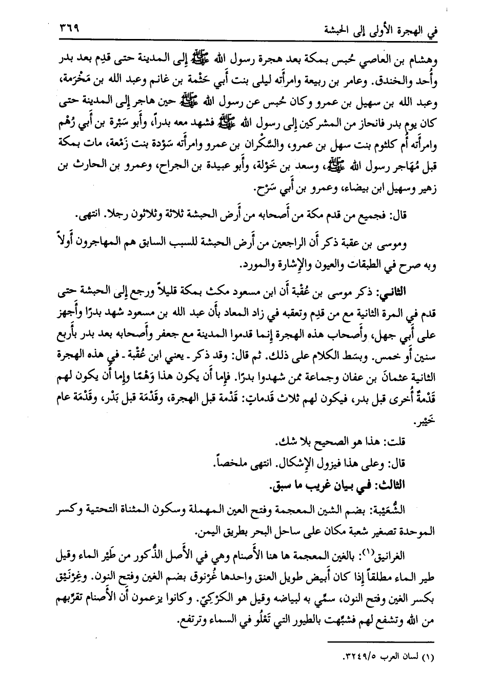 وموسى بن عقبة ذكر أن الراجعين من أرض الحبشة للسبب السابق هم المهاجرون أولا وبه صرح في الطبقات والعيون والإشارة والمورد.