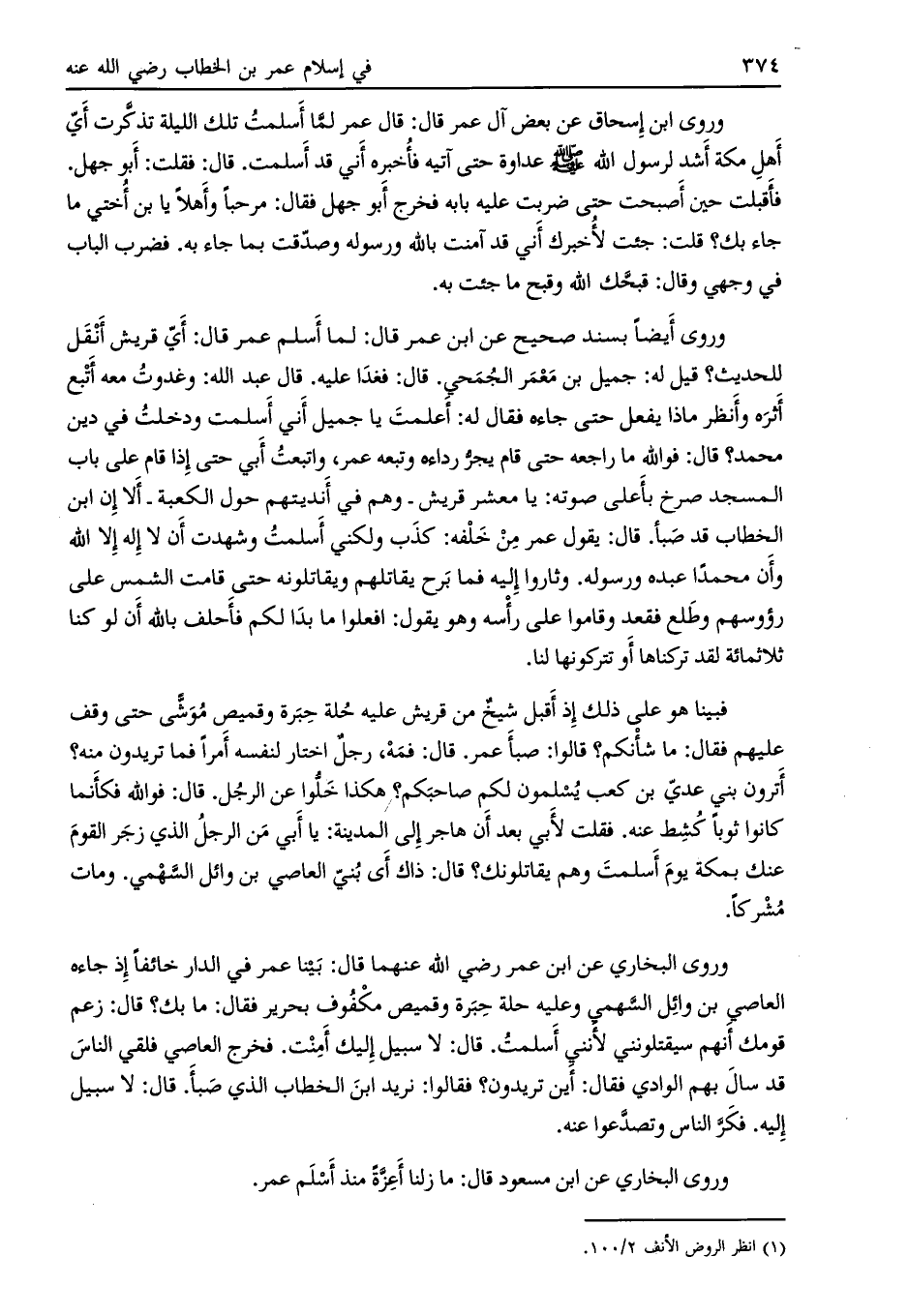 وروى أيضاً بسند صحيح عن ابن عمر قال: لما أسلم عمر قال: أيّ قريش أنقل للحديث؟ قيل له: جميل بن معمر الجمحي. قال: فغدا عليه. قال عبد الله: وغدوت معه أتبع أثره وأنظر ماذا يفعل حتى جاءه فقال له: أعلمت يا جميل أني أسلمت ودخلت في دين محمد؟ قال: فو اللَّه ما راجعه حتى قام يجرّ رداءه وتبعه عمر، واتبعت أبي حتى إذا قام على باب المسجد صرخ بأعلى صوته: يا معشر قريش- وهم في أنديتهم حول الكعبة- ألا إن ابن الخطاب قد صبأ. قال: يقول عمر من خلفه: كذب ولكني أسلمت وشهدت أن لا إله إلا اللَّه وأن محمدا عبده ورسوله. وثاروا إليه فما برح يقاتلهم ويقاتلونه حتى قامت الشمس على رؤوسهم وطلع فقعد وقاموا على رأسه وهو يقول: افعلوا ما بدا لكم فأحلف باللَّه أن لو كنا ثلاثمائة لقد تركناها أو تتركونها لنا.