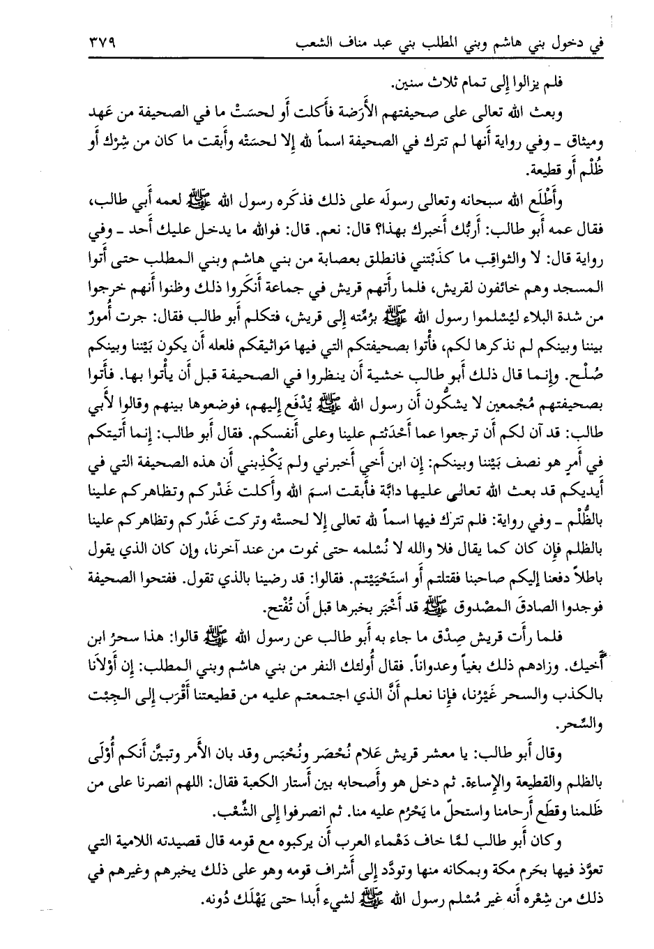 وقال أبو طالب: يا معشر قريش علام نحصر ونحبس وقد بان الأمر وتبيّن أنكم أولى بالظلم والقطيعة والإساءة. ثم دخل هو وأصحابه بين أستار الكعبة فقال: اللهم انصرنا على من ظلمنا وقطع أرحامنا واستحلّ ما يحرّم عليه منا. ثم انصرفوا إلى الشّعب.