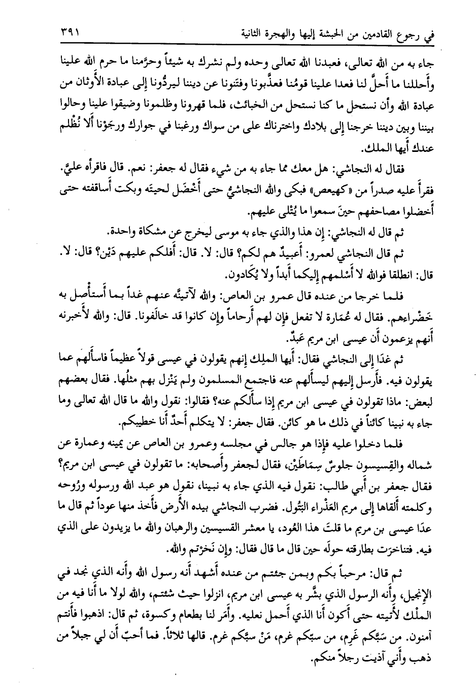 فلما دخلوا عليه فإذا هو جالس في مجلسه وعمرو بن العاص عن يمينه وعمارة عن شماله والقسيسون جلوس سماطين، فقال لجعفر وأصحابه: ما تقولون في عيسى ابن مريم؟