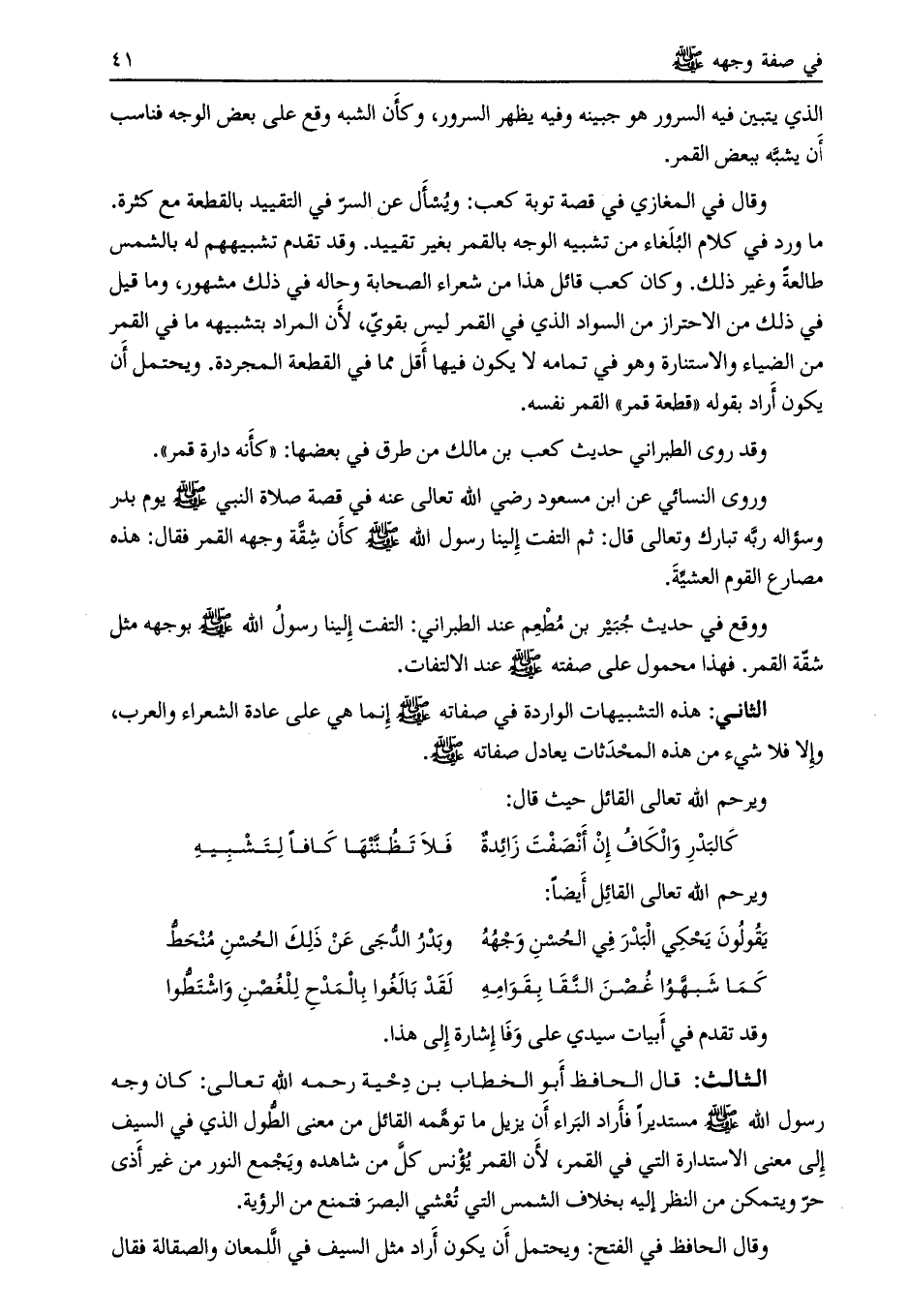الثاني: هذه التشبيهات الواردة في صفاته صلى اللَّه عليه وسلم إنما هي على عادة الشعراء والعرب، وإلا فلا شيء من هذه المحدثات يعادل صفاته صلى اللَّه عليه وسلم.