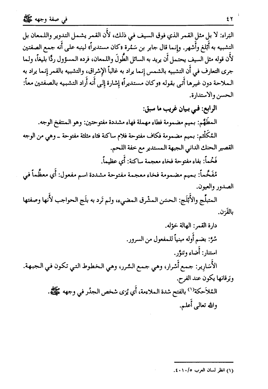 البراء: لا بل مثل القمر الذي فوق السيف في ذلك، لأن القمر يشمل التدوير واللمعان بل التشبيه به أبلغ وأشهر. وإنما قال جابر بن سمرة «كان مستديرا» لينبه على أنه جمع الصفتين لأن قوله مثل السيف يحتمل أن يريد به السائل الطول واللمعان، فرده المسؤول ردا بليغا، ولما جرى التعارف في أن التشبيه بالشمس إنما يراد به غالبا الإشراق، والتشبيه بالقمر إنما يراد به الملاحة دون غيرها أتى بقوله «وكان مستديرا» إشارة إلى أنه أراد التشبيه بالصفتين معا: