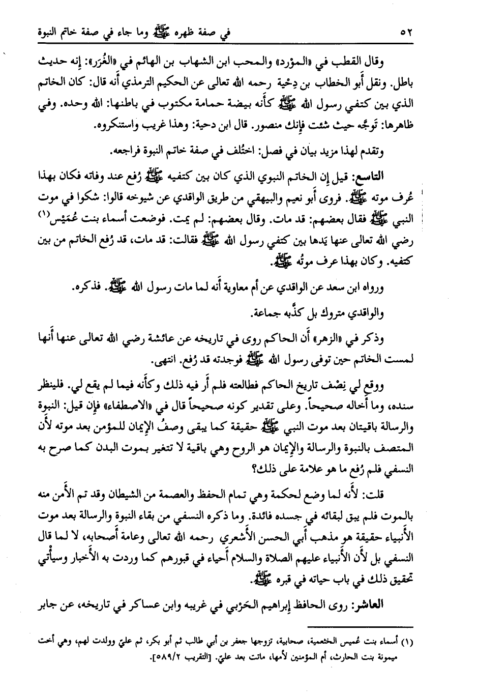 التاسع: قيل أن الخاتم النبوي الذي كان بين كتفيه صلى اللَّه عليه وسلم رفع عند وفاته فكان بهذا عرف موته صلى اللَّه عليه وسلم. فروى أبو نعيم والبيهقي من طريق الواقدي عن شيوخه قالوا: شكوا في موت النبي صلى اللَّه عليه وسلم فقال بعضهم: قد مات. وقال بعضهم: لم يمت. فوضعت أسماء بنت عميس [ (1) ] .