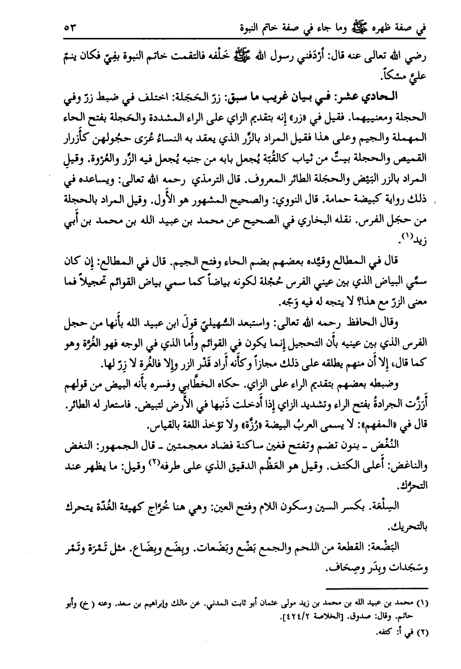الحادي عشر: في بيان غريب ما سبق: زر الحجلة: اختلف في ضبط زر وفي الحجلة ومعنييهما. فقيل في «زر» إنه بتقديم الزاي على الراء المشددة والحجلة بفتح الحاء المهملة والجيم وعلى هذا فقيل المراد بالزر الذي يعقد به النساء عرى حجولهن كأزرار القميص والحجلة بيت من ثياب كالقبة يجعل بابه من جنبه يجعل فيه الزر والعروة. وقيل المراد بالزر البيض والحجلة الطائر المعروف. قال الترمذي رحمه اللَّه تعالى: ويساعده في ذلك رواية كبيضة حمامة. قال النووي: والصحيح المشهور هو الأول. وقيل المراد بالحجلة من حجل الفرس. نقله البخاري في الصحيح عن محمد بن عبيد اللَّه بن محمد بن أبي زيد [ (1) ] .
