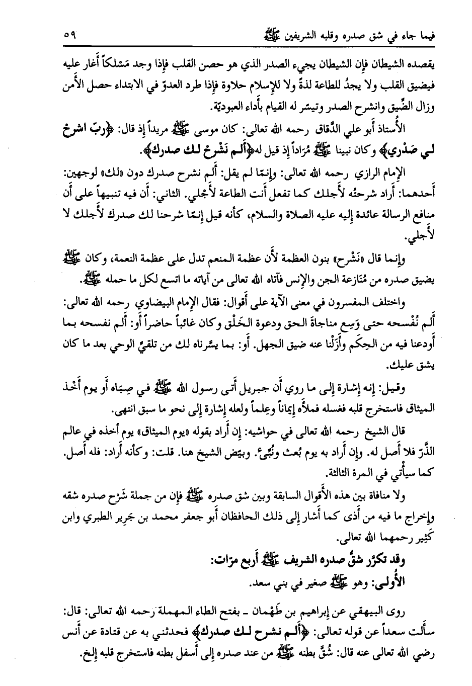 سألت سعدا عن قوله تعالى: أَلَمْ نَشْرَحْ لَكَ صَدْرَكَ فحدثني به عن قتادة عن أنس رضي اللَّه تعالى عنه قال: شق بطنه صلى الله عليه وسلم من عند صدره إلى أسفل بطنه فاستخرج قلبه الخ.