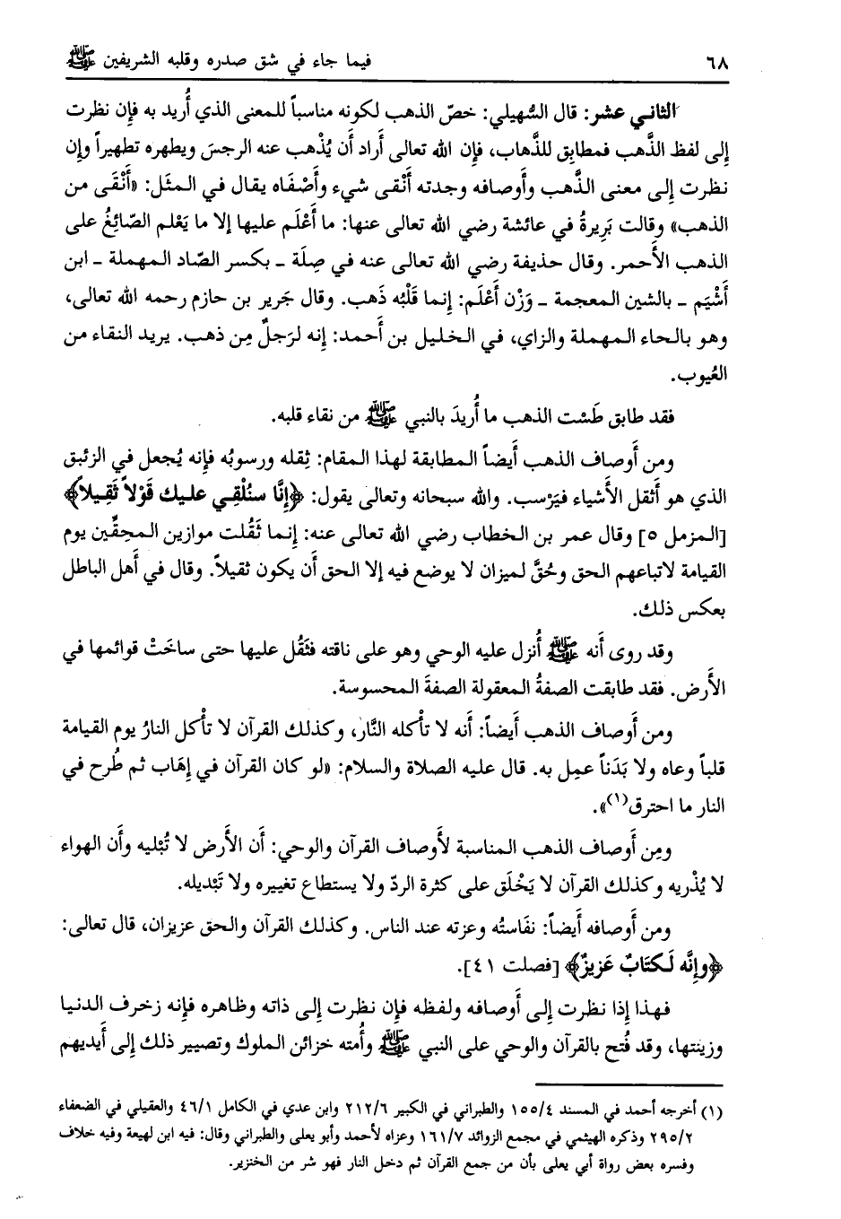 ومن أوصاف الذهب المناسبة لأوصاف القرآن والوحي: أن الأرض لا تبليه وأن الهواء لا يذريه وكذلك القرآن لا يخلق على كثرة الرد ولا يستطاع تغييره ولا تبديله.