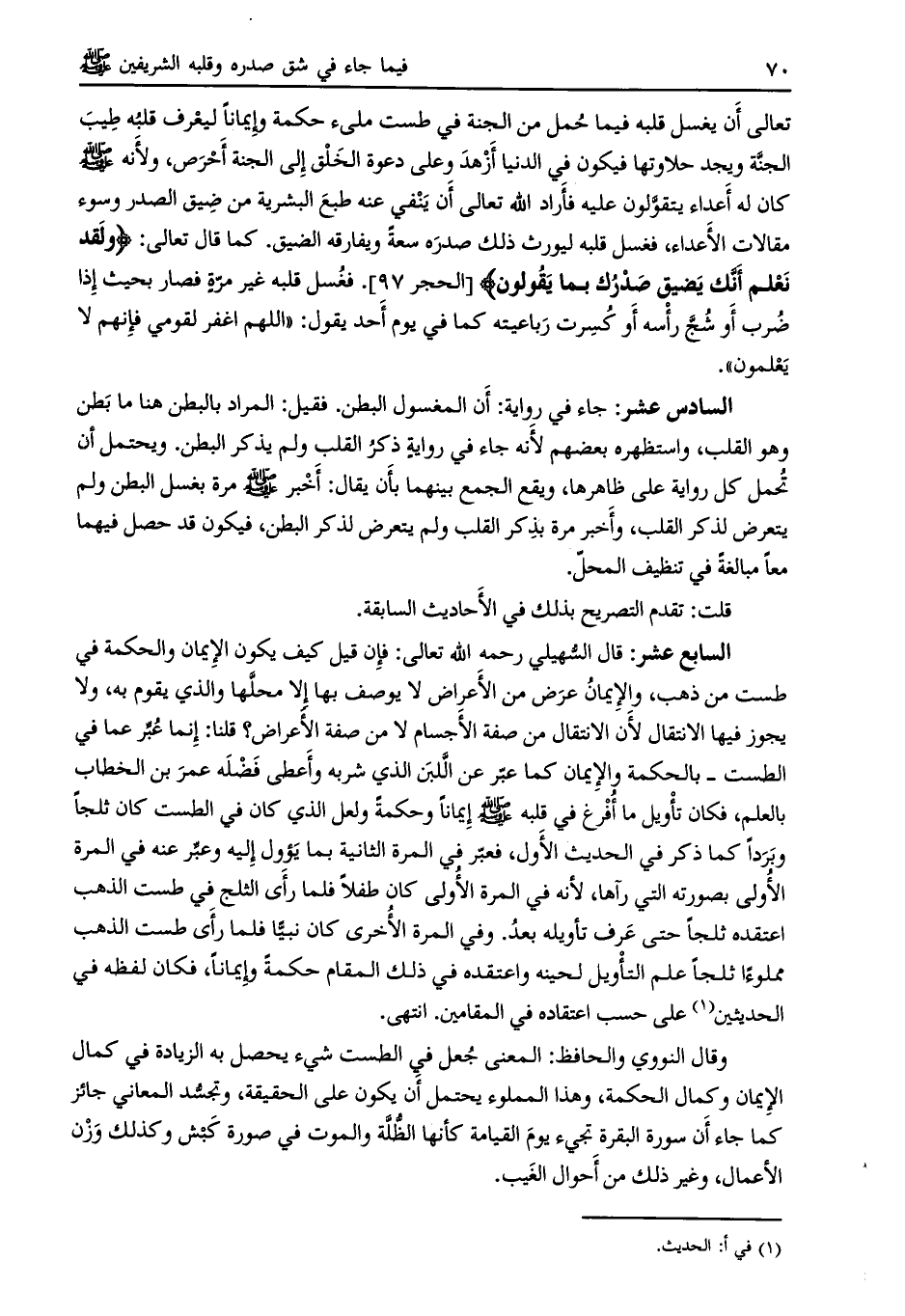 السادس عشر: جاء في رواية: أن المغسول البطن. فقيل: المراد بالبطن هنا ما بطن وهو القلب، واستظهره بعضهم لأنه جاء في رواية ذكر القلب ولم يذكر البطن. ويحتمل أن تحمل كل رواية على ظاهرها، ويقع الجمع بينهما بأن يقال: أخبر صلى الله عليه وسلم مرة بغسل البطن ولم يتعرض لذكر القلب، وأخبر مرة بذكر القلب ولم يتعرض لذكر البطن، فيكون قد حصل فيهما معا مبالغة في تنظيف المحل.