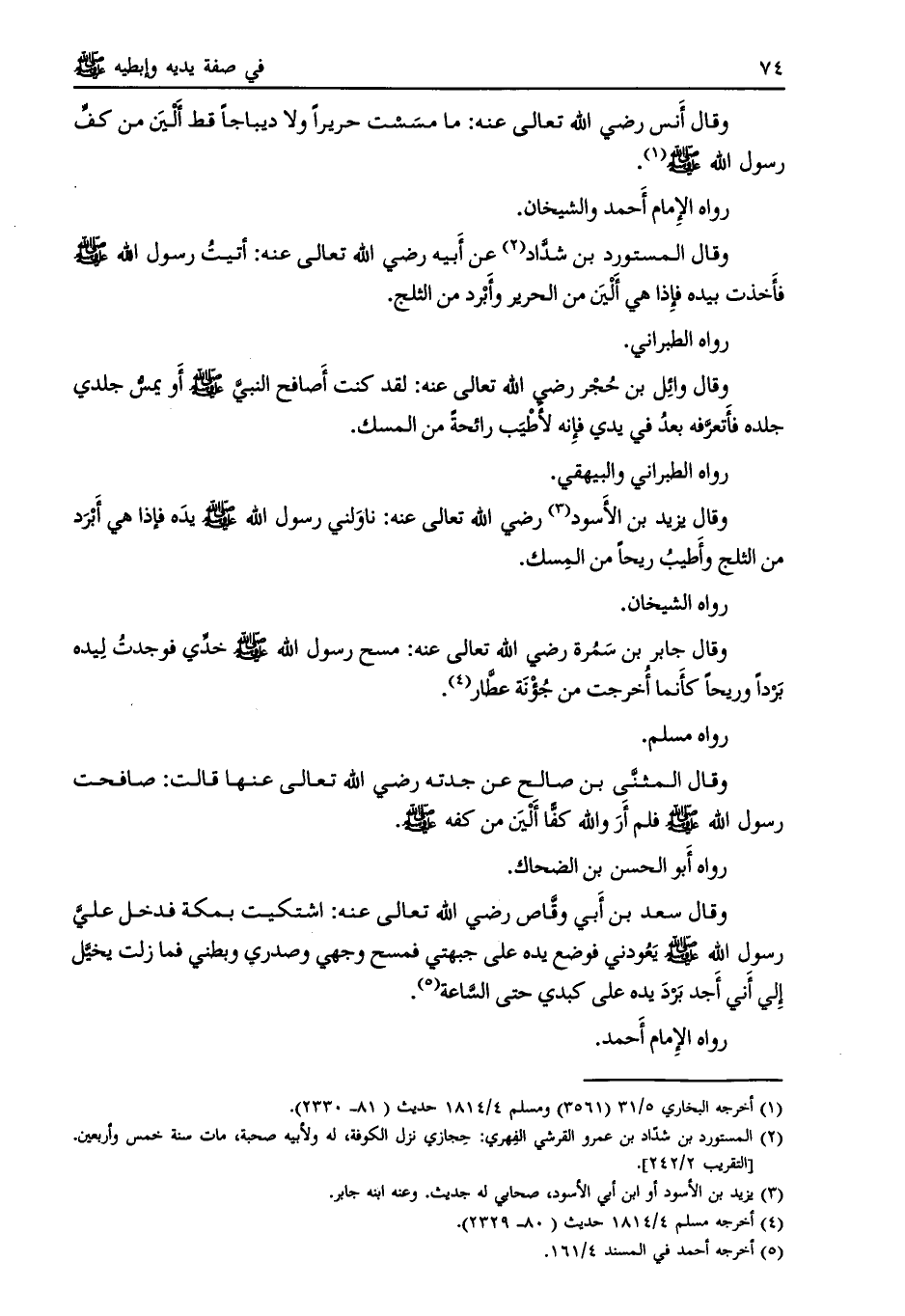 وقال المستورد بن شداد [ (2) ] عن أبيه رضي اللَّه تعالى عنه: أتيت رسول اللَّه صلى اللَّه عليه وسلم فأخذت بيده فإذا هي ألين من الحرير وأبرد من الثلج.