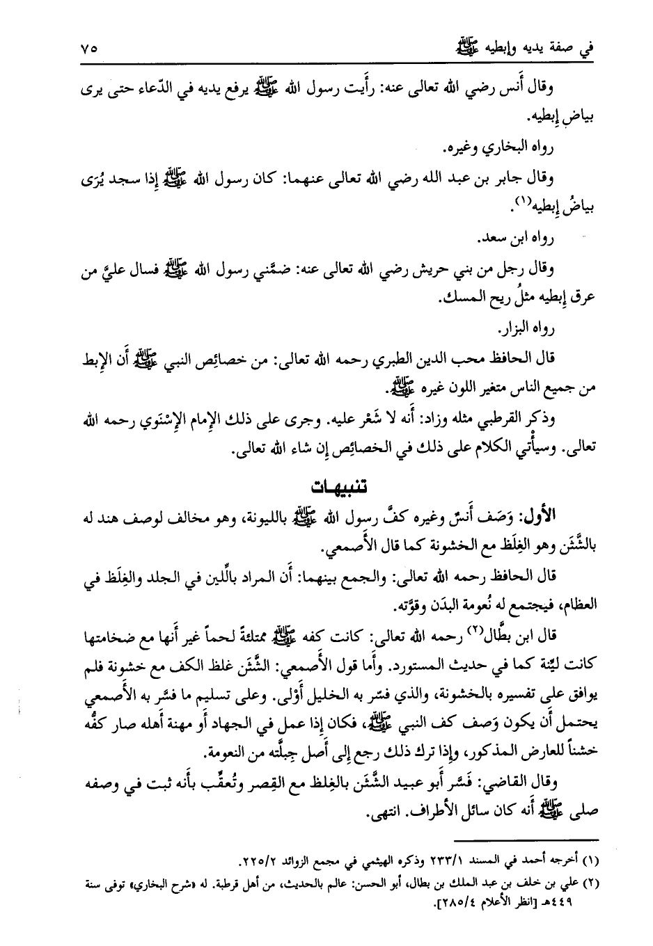 قال ابن بطال [ (2) ] رحمه اللَّه تعالى: كانت كفه صلى اللَّه عليه وسلم ممتلئة لحما غير أنها مع ضخامتها كانت لينة كما في حديث المستورد. وأما قول الأصمعي: الشثن غلظ الكف مع خشونة فلم يوافق على تفسيره بالخشونة، والذي فسر به الخليل أولى. وعلى تسليم ما فسر به الأصمعي يحتمل أن يكون وصف كف النبي صلى اللَّه عليه وسلم، فكان إذا عمل في الجهاد أو مهنة أهله صار كفه خشنا للعارض المذكور، وإذا ترك ذلك رجع إلى أصل جبلته من النعومة.