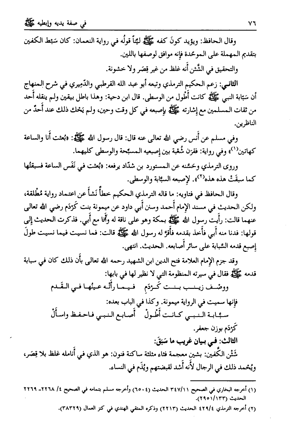 الثاني: زعم الحكيم الترمذي وتبعه أبو عبد الله القرطبي والدميري في شرح المنهاج أن سبابة النبي صلى اللَّه عليه وسلم كانت أطول من الوسطى. قال ابن دحية: وهذا باطل بيقين ولم ينقله أحد من ثقات المسلمين مع إشارته صلى اللَّه عليه وسلم بأصبعه في كل وقت وحين، ولم يحك ذلك عند أحد من الناظرين.