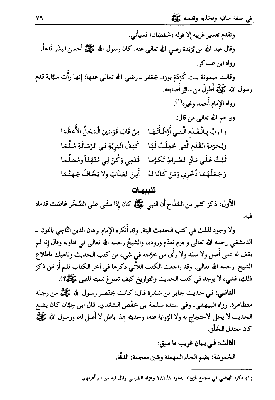 الثاني: في حديث جابر بن سمرة قال: كانت خنصر رسول اللَّه صلى اللَّه عليه وسلم من رجله متظاهرة. رواه البيهقي. وفي سنده سلمة بن حفص السعدي. قال ابن حبان كان يضع الحديث لا يحل الاحتجاج به ولا الرّواية عنه، وحديثه هذا باطل لا أصل له، ورسول اللَّه صلى اللَّه عليه وسلم كان معتدل الخلق.