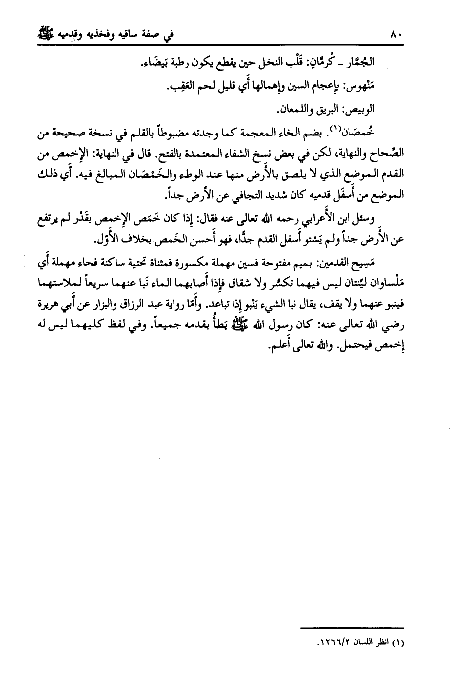 خصمان [ (1) ] . بضم الخاء المعجمة كما وجدته مضبوطا بالقلم في نسخة صحيحة من الصحاح والنهاية، لكن في بعض نسخ الشفاء المعتمدة بالفتح. قال في النهاية: الأخمص من القدم الموضع الذي لا يلصق بالأرض منها عند الوطء والخمصان المبالغ فيه. أي ذلك الموضع من أسفل قدميه كان شديد التجافي عن الأرض جدا.
