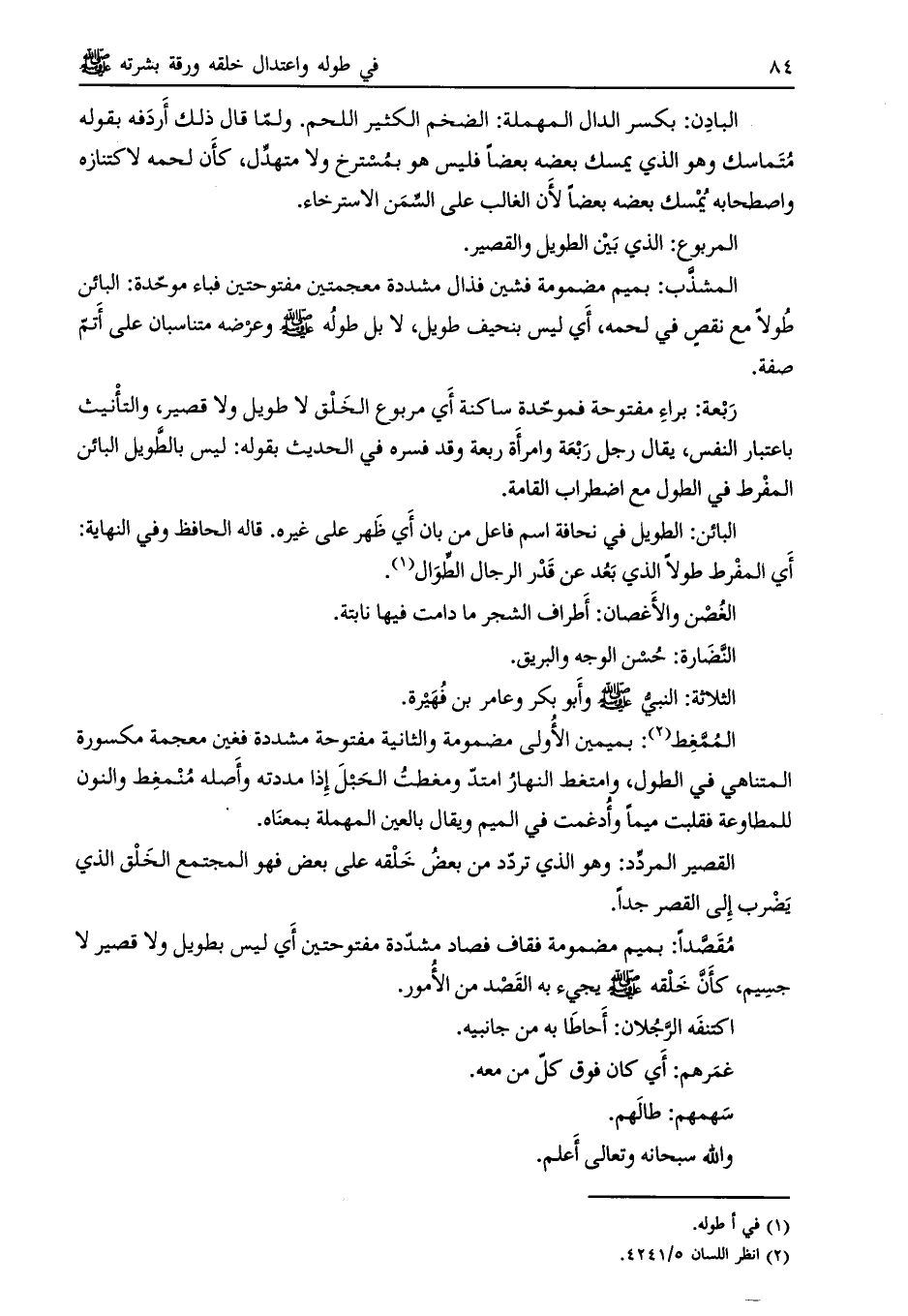 مقصدا: بميم مضمومة فقاف فصاد مشددة مفتوحتين أي ليس بطويل ولا قصير لا جسيم، كأن خلقه صلى اللَّه عليه وسلم يجيء به القصد من الأمور.