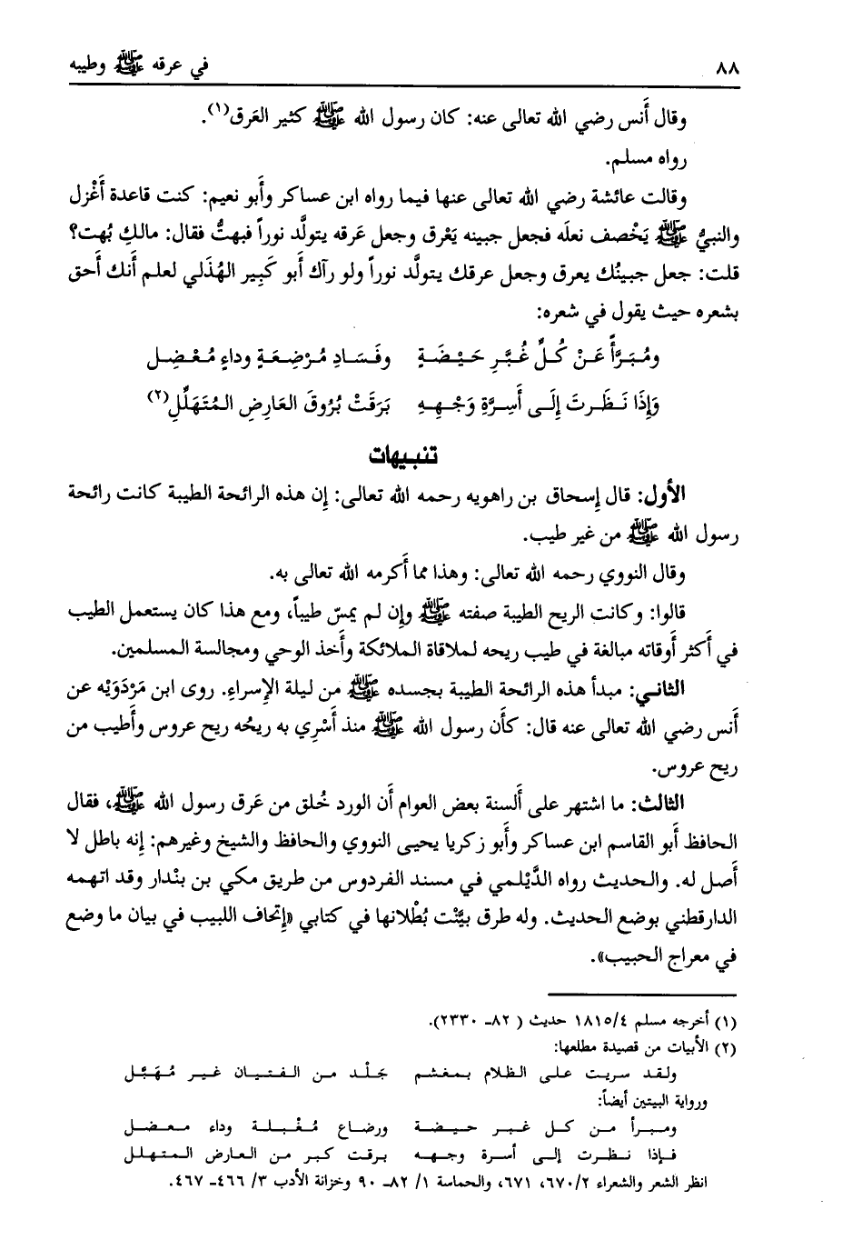 الثاني: مبدأ هذه الرائحة الطيبة بجسده صلى اللَّه عليه وسلم من ليلة الإسراء. روى ابن مردويه عن أنس رضي اللَّه تعالى عنه قال: كان رسول اللَّه صلى اللَّه عليه وسلم منذ أسري به ريحه ريح عروس وأطيب من ريح عروس.