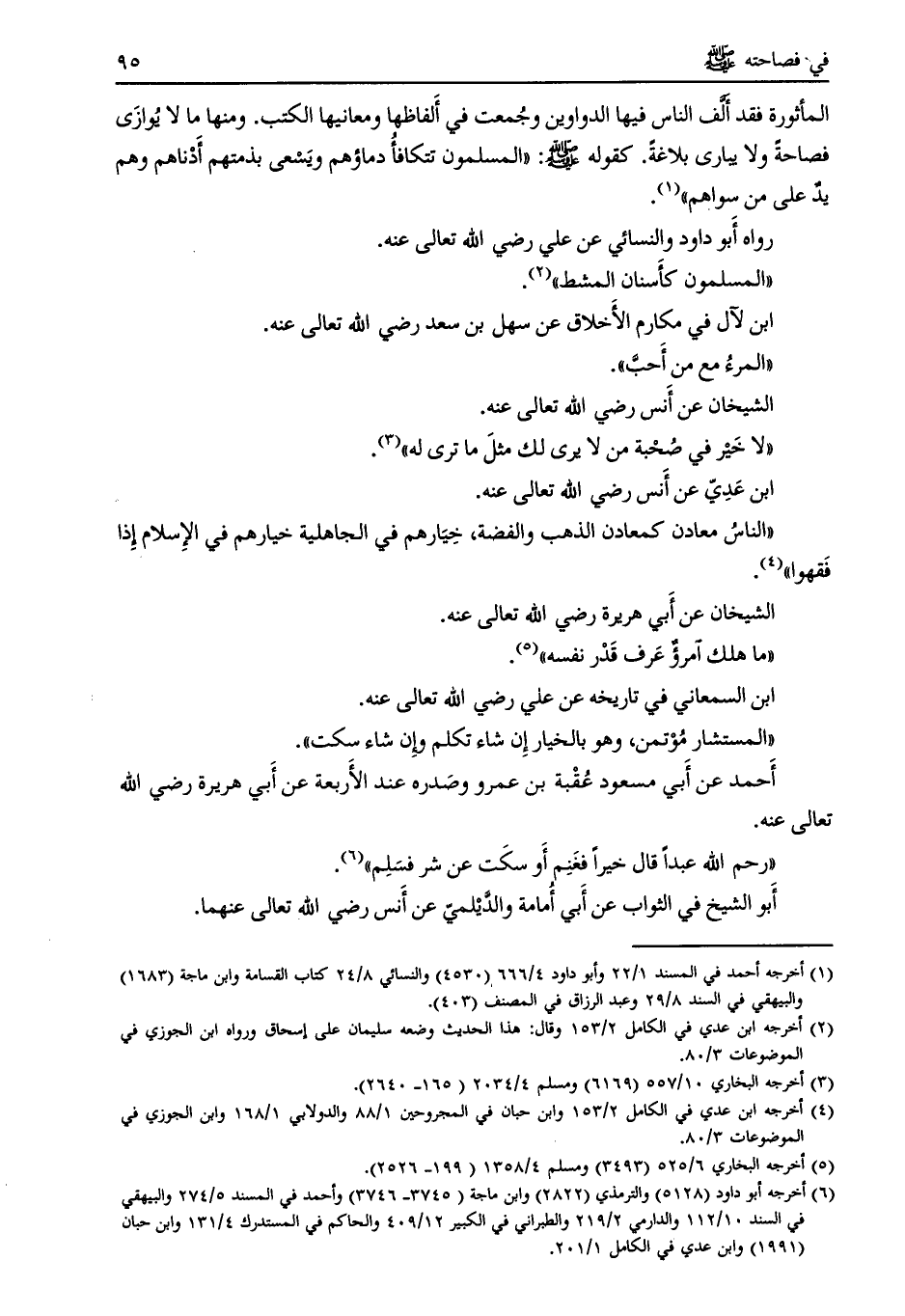 المأثورة فقد ألف الناس فيها الدواوين وجمعت في ألفاظها ومعانيها الكتب. ومنها ما لا يوازى فصاحة ولا يبارى بلاغة.