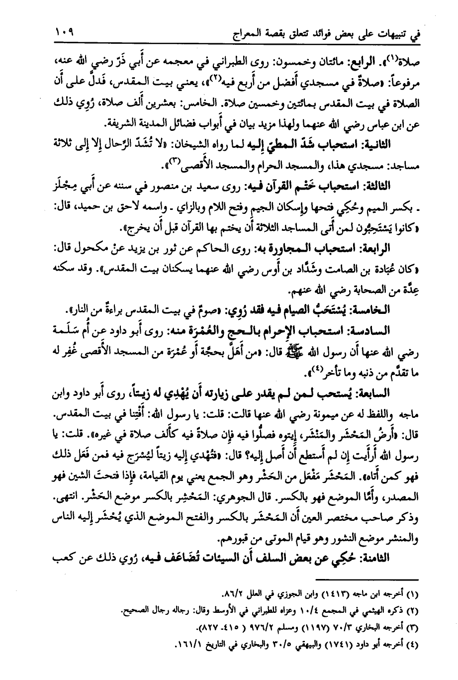صلاة [ (1) ] » . الرابع: مائتان وخمسون: روى الطبراني في معجمه عن أبي ذر رضي الله عنه، مرفوعاً: «صلاة في مسجدي أفضل من أربع فيه [ (2) ] » ، يعني بيت المقدس، فدل على أن الصلاة في بيت المقدس بمائتين وخمسين صلاة. الخامس: بعشرين ألف صلاة، روي ذلك عن ابن عباس رضي الله عنهما ولهذا مزيد بيان في أبواب فضائل المدينة الشريفة.