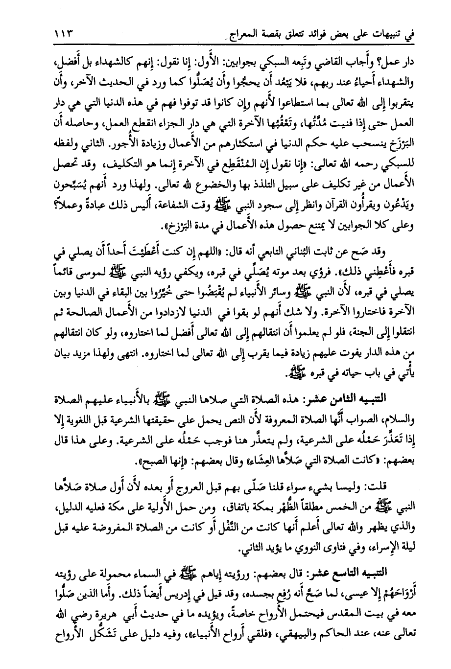 دار عمل؟ وأجاب القاضي وتبعه السبكي بجوابين: الأول: إنا نقول: إنهم كالشهداء بل أفضل، والشهداء أحياء عند ربهم، فلا يبعد أن يحجّوا وأن يصلّوا كما ورد في الحديث الآخر، وأن يتقربوا إلى الله تعالى بما استطاعوا لأنهم وإن كانوا قد توفوا فهم في هذه الدنيا التي هي دار العمل حتى إذا فنيت مدّتها، وتعقبها الآخرة التي هي دار الجزاء انقطع العمل، وحاصله أن البرزخ ينسحب عليه حكم الدنيا في استكثارهم من الأعمال وزيادة الأجور. الثاني ولفظه للسبكي رحمه الله تعالى: «إنا نقول إن المنقطع في الآخرة إنما هو التكليف، وقد تحصل الأعمال من غير تكليف على سبيل التلذذ بها والخضوع لله تعالى. ولهذا ورد أنهم يسبّحون ويدعون ويقرأون القرآن وانظر إلى سجود النبي صلى الله عليه وسلم وقت الشفاعة، أليس ذلك عبادة وعملا؟