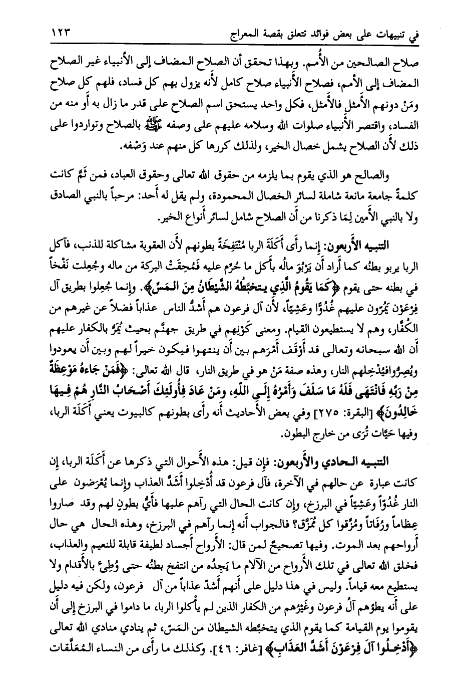إنما رأى أكلة الربا منتفخة بطونهم لأن العقوبة مشاكلة للذنب، فآكل الربا يربو بطنه كما أراد أن يربو ماله بأكل ما حرّم عليه فمحقت البركة من ماله وجعلت نفخا في بطنه حتى يقوم كَما يَقُومُ الَّذِي يَتَخَبَّطُهُ الشَّيْطانُ مِنَ الْمَسِّ. وإنما جعلوا بطريق آل فرعون يمرّون عليهم غدوّا وعشيّا، لأن آل فرعون هم أشدّ الناس عذابا فضلا عن غيرهم من الكفّار، وهم لا يستطيعون القيام. ومعنى كونهم في طريق جهنّم بحيث يمرّ بالكفار عليهم أن الله سبحانه وتعالى قد أوقف أمرهم بين أن ينتهوا فيكون خيرا لهم وبين أن يعودوا ويصرّوا فيدخلهم النار، وهذه صفة من هو في طريق النار، قال الله تعالى: فَمَنْ جاءَهُ مَوْعِظَةٌ مِنْ رَبِّهِ فَانْتَهى فَلَهُ ما سَلَفَ وَأَمْرُهُ إِلَى اللَّهِ، وَمَنْ عادَ فَأُولئِكَ أَصْحابُ النَّارِ هُمْ فِيها خالِدُونَ [البقرة: 275] وفي بعض الأحاديث أنه رأى بطونهم كالبيوت يعني أكلة الربا، وفيها حيّات ترى من خارج البطون.
