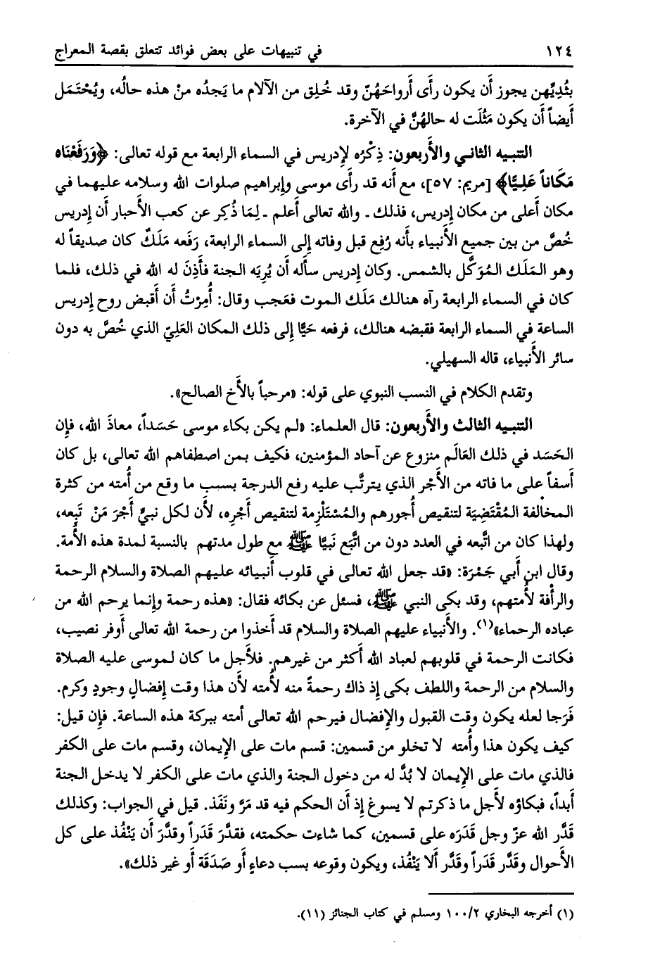 ذكره لإدريس في السماء الرابعة مع قوله تعالى: وَرَفَعْناهُ مَكاناً عَلِيًّا [مريم: 57] ، مع أنه قد رأى موسى وإبراهيم صلوات الله وسلامه عليهما في مكان أعلى من مكان إدريس، فذلك- والله تعالى أعلم- لما ذكر عن كعب الأحبار أن إدريس خصّ من بين جميع الأنبياء بأنه رفع قبل وفاته إلى السماء الرابعة، رفعه ملك كان صديقا له وهو الملك الموكّل بالشمس. وكان إدريس سأله أن يريه الجنة فأذن له الله في ذلك، فلما كان في السماء الرابعة رآه هنالك ملك الموت فعجب وقال: أمرت أن أقبض روح إدريس الساعة في السماء الرابعة فقبضه هنالك، فرفعه حيّا إلى ذلك المكان العليّ الذي خص به دون سائر الأنبياء، قاله السهيلي.