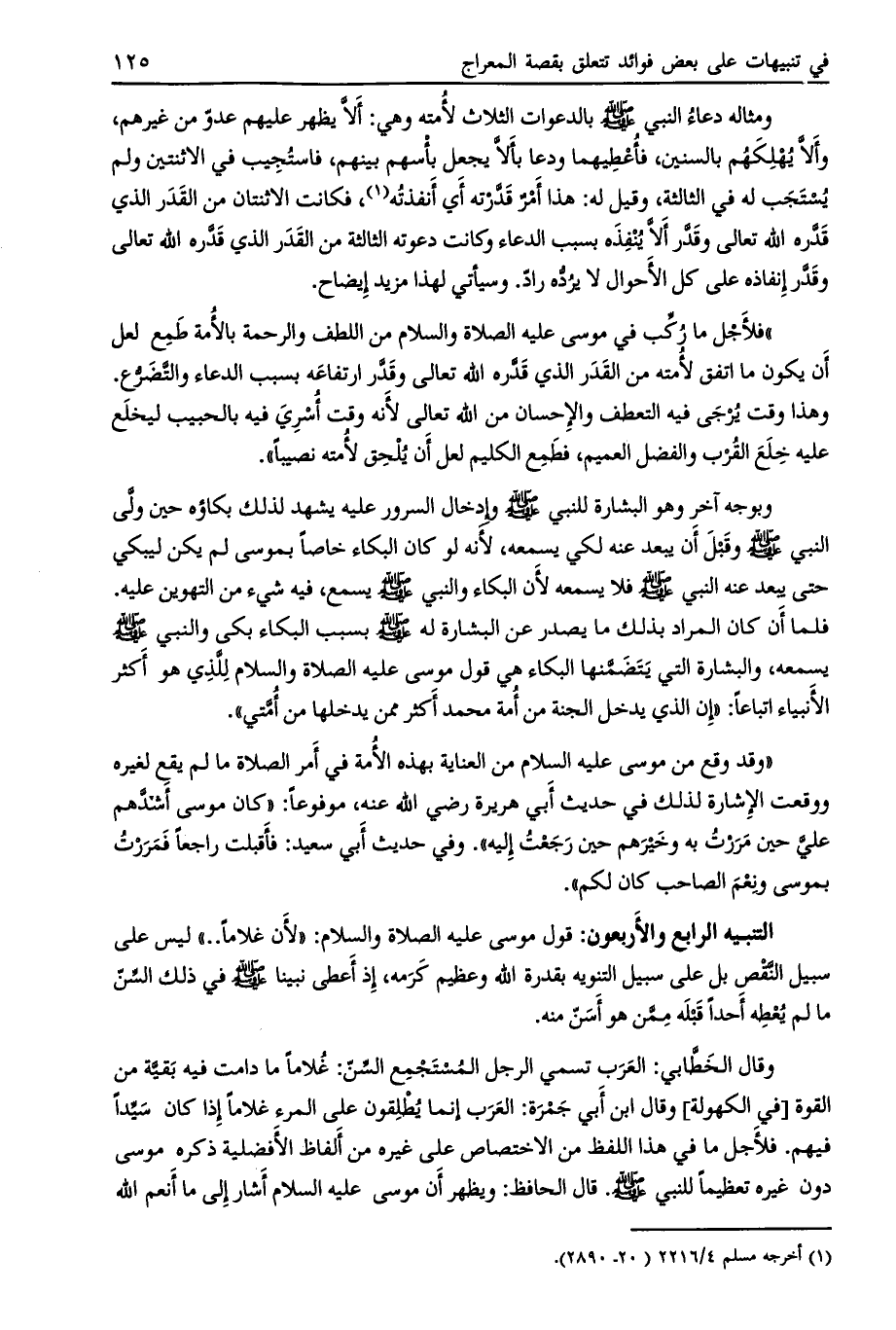 «وقد وقع من موسى عليه السلام من العناية بهذه الأمة في أمر الصلاة ما لم يقع لغيره ووقعت الإشارة لذلك في حديث أبي هريرة رضي الله عنه، مرفوعا: «كان موسى أشدّهم عليّ حين مررت به وخيرهم حين رجعت إليه» . وفي حديث أبي سعيد: فأقبلت راجعا فمررت بموسى ونعم الصاحب كان لكم» .