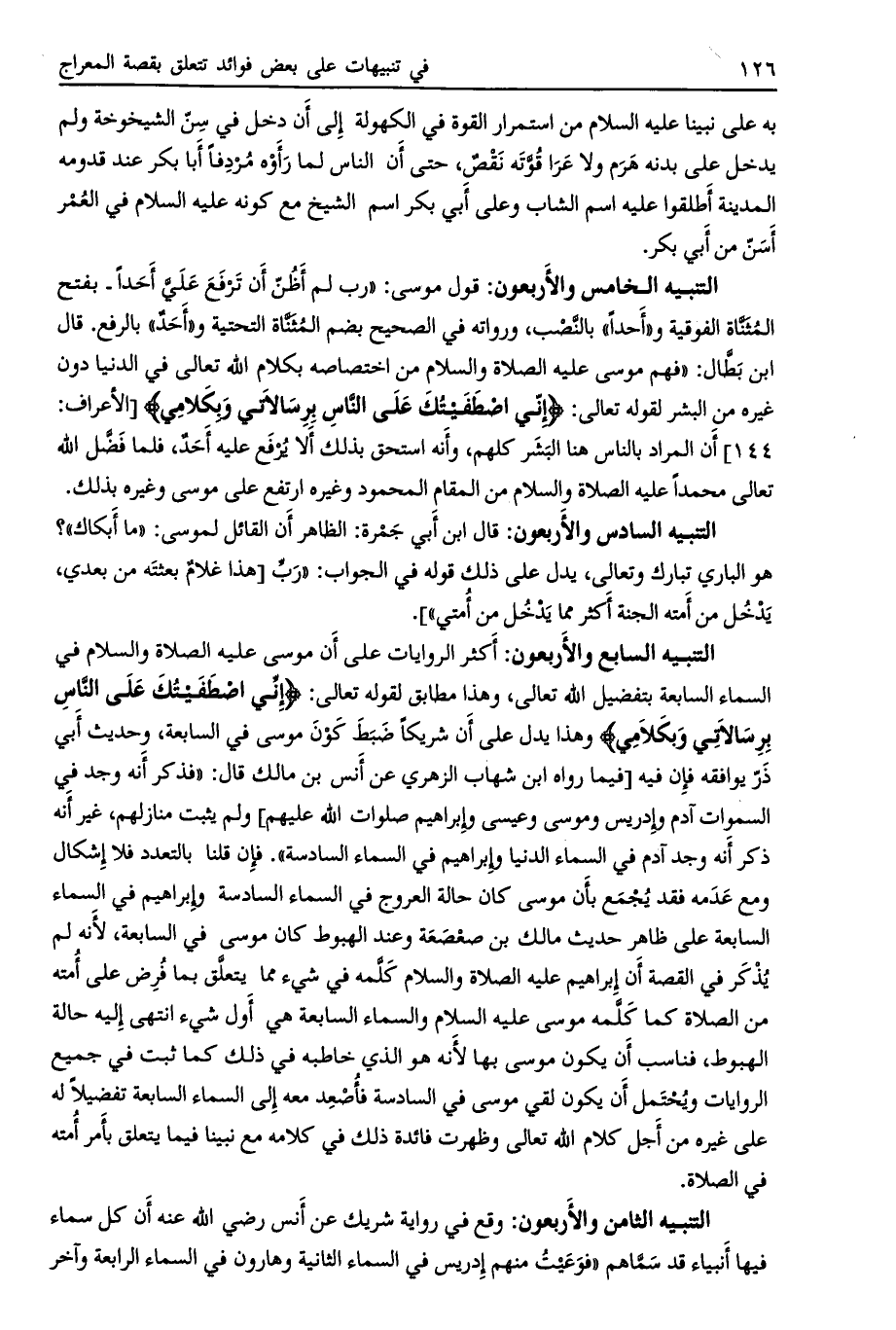 أكثر الروايات على أن موسى عليه الصلاة والسلام في السماء السابعة بتفضيل الله تعالى، وهذا مطابق لقوله تعالى: إِنِّي اصْطَفَيْتُكَ عَلَى النَّاسِ بِرِسالاتِي وَبِكَلامِي وهذا يدل على أن شريكا ضبط كون موسى في السابعة، وحديث أبي ذر يوافقه فإن فيه [فيما رواه ابن شهاب الزهري عن أنس بن مالك قال: «فذكر أنه وجد في السموات آدم وإدريس وموسى وعيسى وإبراهيم صلوات الله عليهم] ولم يثبت منازلهم، غير أنه ذكر أنه وجد آدم في السماء الدنيا وإبراهيم في السماء السادسة» . فإن قلنا بالتعدد فلا إشكال ومع عدمه فقد يجمع بأن موسى كان حالة العروج في السماء السادسة وإبراهيم في السماء السابعة على ظاهر حديث مالك بن صعصعة وعند الهبوط كان موسى في السابعة، لأنه لم يذكر في القصة أن إبراهيم عليه الصلاة والسلام كلّمه في شيء مما يتعلّق بما فرض على أمته من الصلاة كما كلّمه موسى عليه السلام والسماء السابعة هي أول شيء انتهى إليه حالة الهبوط، فناسب أن يكون موسى بها لأنه هو الذي خاطبه في ذلك كما ثبت في جميع الروايات ويحتمل أن يكون لقي موسى في السادسة فأصعد معه إلى السماء السابعة تفضيلا له على غيره من أجل كلام الله تعالى وظهرت فائدة ذلك في كلامه مع نبينا فيما يتعلق بأمر أمته في الصلاة.