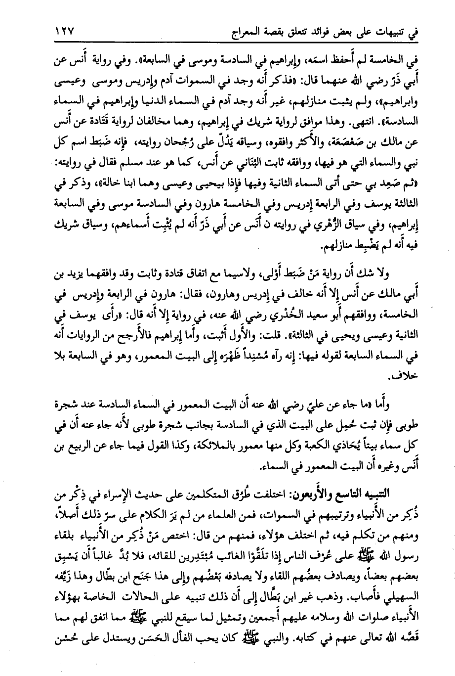 ولا شك أن رواية من ضبط أولى، ولا سيما مع اتفاق قتادة وثابت وقد وافقهما يزيد بن أبي مالك عن أنس إلا أنه خالف في إدريس وهارون، فقال: هارون في الرابعة وإدريس في الخامسة، ووافقهم أبو سعيد الخدري رضي الله عنه، في رواية إلا أنه قال: «رأى يوسف في الثانية وعيسى ويحيى في الثالثة» . قلت: والأول أثبت، وأما إبراهيم فالأرجح من الروايات أنه في السماء السابعة لقوله فيها: إنه رآه مسندا ظهره إلى البيت المعمور، وهو في السابعة بلا خلاف.